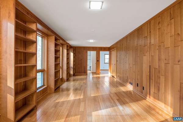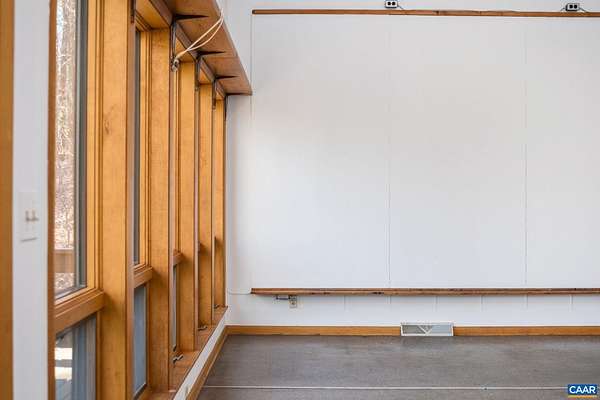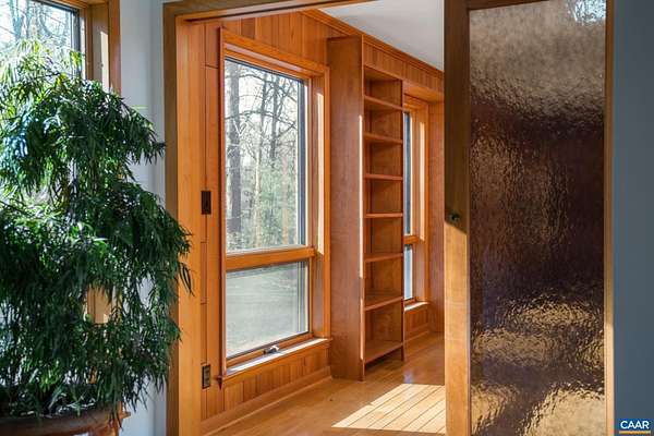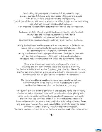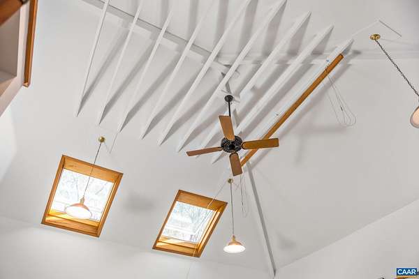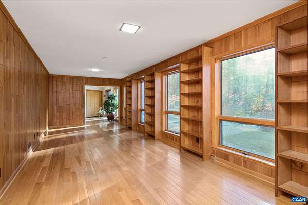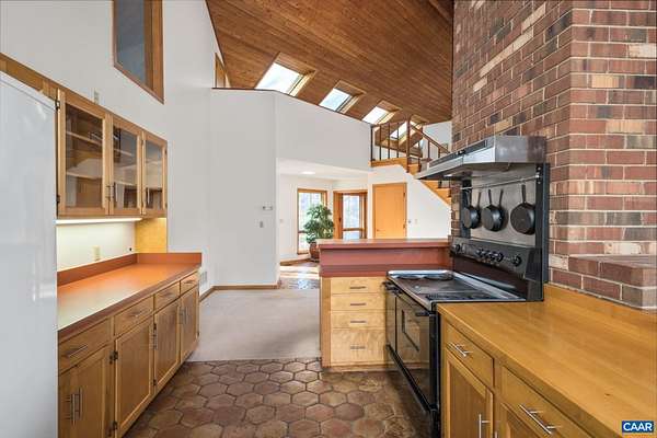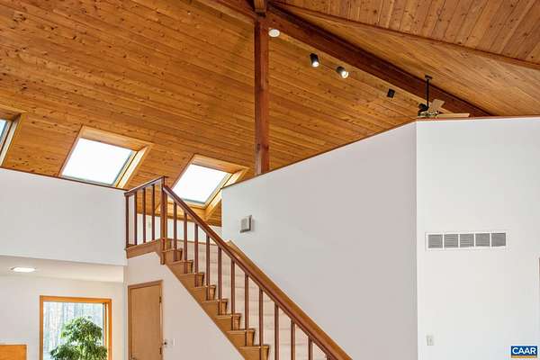WOODHAVEN: Home, Santuary, Art-- A Rare Mid-Century Modern Retreat shaped around Light, Space, and Spirit. Centered on a dramatic two-story art studio, this seven-sided architecture home offers an open floor plan with soaring ceilings, a sun-drenched loft wrapped in windows, and solar-powered remote skylights that bathe the space in natural inspiration. A custom oversized fireplace and towering two-story brick chimney anchor the living, dining, and creative areas into one seamless experience where modern sophistication meets the warmth of organic wood and stone. Hand-cut wood floors and terra cotta tiles with geothermal radiant heat set a grounded, inviting tone, complemented by a handcrafted cherry-paneled library. Recent upgrades include a new roof with copper ducts and vents, Trane 5-ton heat pump, Norwegian pine deck, loft patio and floating front porch, full exterior stain, complete interior paint, refreshed primary and basement baths. Perfect for artists, designers, wellness practitioners, photographers, or any home-based professional seeking abundant natural light and true creative freedom. Modern Woodhaven is not just a home--it's a retreat, a studio, and a living work of art.