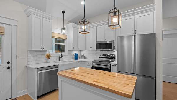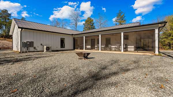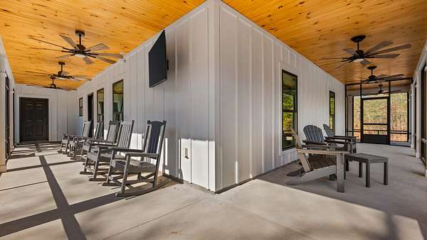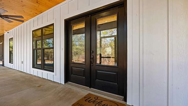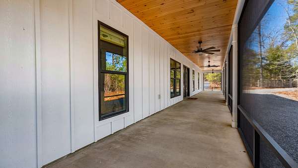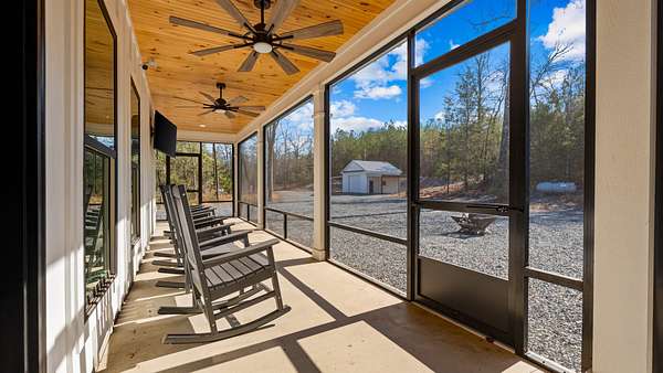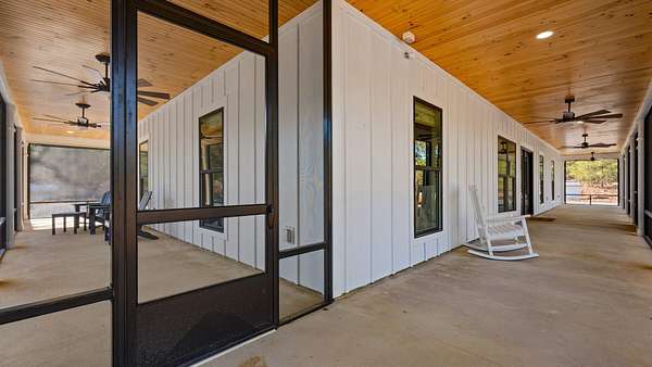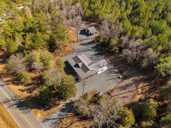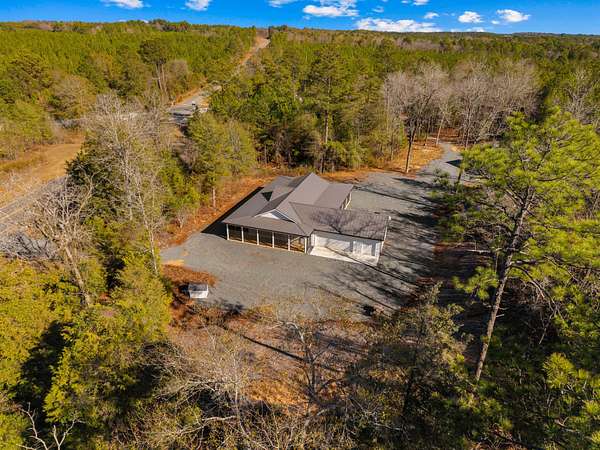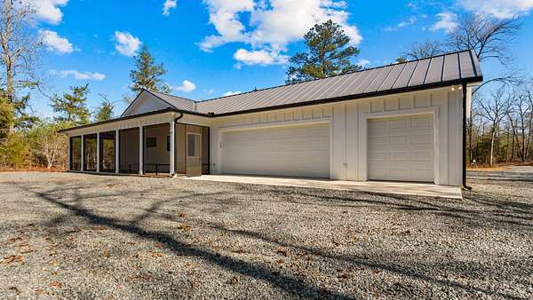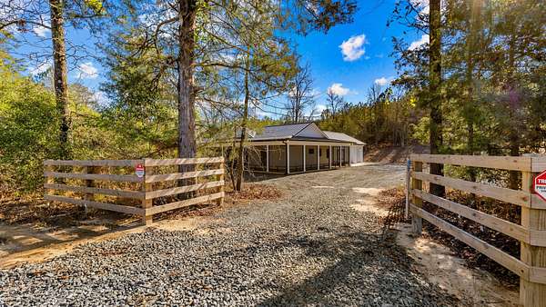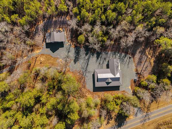 The home is a brand-new custom construction that offers 3,942 sq. ft. under roof with 1,768 sq. ft. heated and cooled, featuring 3 bedrooms, 2 bathrooms, and a office, and is being sold fully furnished with stainless steel appliances. The home showcases an open, modern interior with quality finishes, and great natural light throughout. A wraparound screened porch provides outdoor living space, while the attached garage includes a storage room and a separate golf cart garage for added convenience. The property also includes a matching detached shop with two lean-tos, perfect for equipment, feed, stands, or general storage, all connected by a gravel driveway that winds from the home to the shop.
