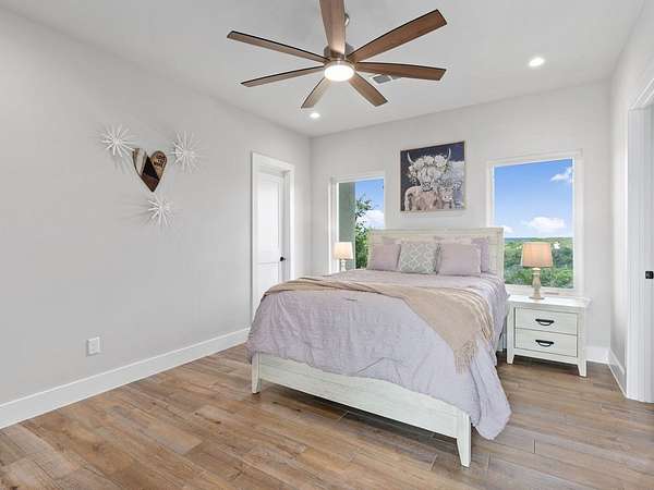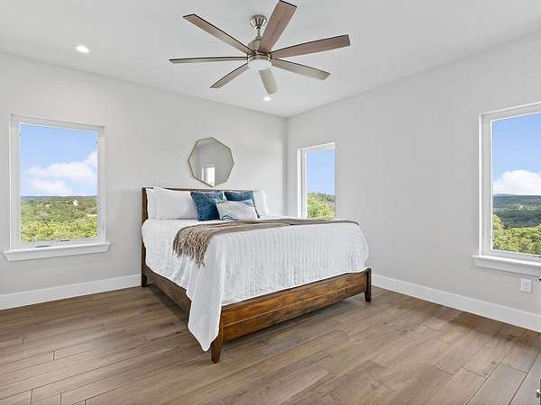 Nestled in the heart of Texas Hill Country, this expansive, pristine, picturesque, ag exempt property spans several acres of rolling landscape with spectacular views. The grand meticulously designed 5142 sq ft home plus detached 3347 sq ft 10-car massive car barn offers sweeping views of surrounding hills and valleys.The residence itself is an architectural masterpiece! Constructed with natural stone and wood accents, it features large windows and spacious balconies that invite you to savor the breathtaking panoramas. Inside the home boasts high ceilings, an open floor plan, and luxurious finishes including a gourmet kitchen with 6 burner plus grill gas cook-top, custom cabinets, expansive island, and designer quartz counters throughout.The master retreat with spa-like bathroom has monumental closet space, shower with steam spa, plus extra hideaway.Giant media room with adjoining card room/man cave with wet bar are priceless.Spacious first level office with outside access, more stunning views. The $76K Sonos Sound System is beyond spectacular!Exquisite infinity swimming pool with built in barstools is a masterpiece, offering panoramic vistas that mesmerize. Check out the acre pond!