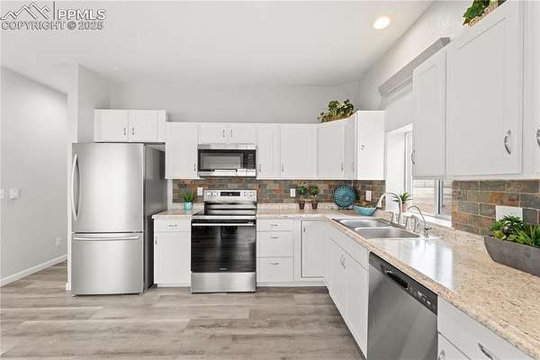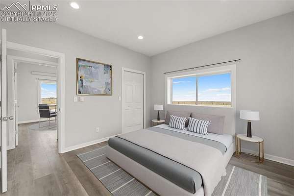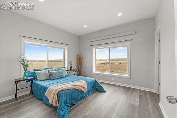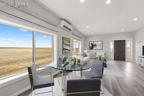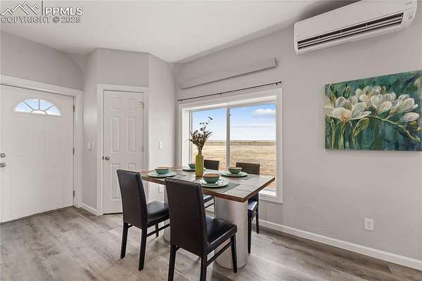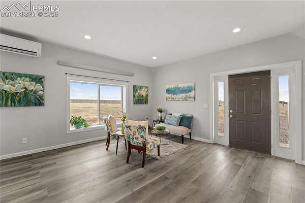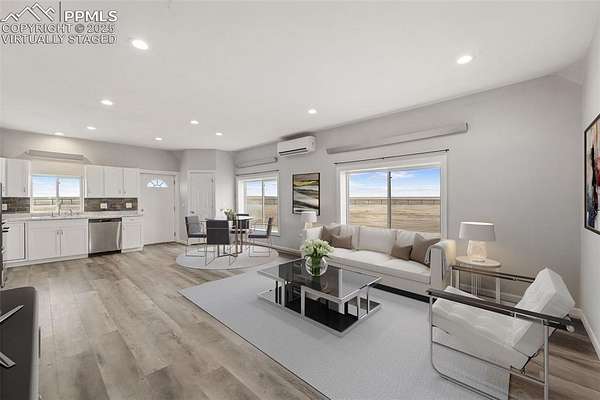 Horse property with room to roam! Situated on 2.81 acres in the quiet, welcoming Tanner Ranch community, this 3-bedroom, 2-bath home offers expansive mountain views and the peaceful pace of country living. Built in 2018 (site-built, not modular) with energy-efficient block construction and stucco walls, it features cove radiant heating throughout and a Fujitsu split unit for cooling. The open-concept layout connects the kitchen to spacious living and dining areas, creating a warm gathering place for family and friends. A radon mitigation system provides added peace of mind. The permitted well supports watering for up to two large domestic animals, making it ideal for horses or other approved livestock. Ample parking accommodates RVs and trailers, with additional space for gardens or a paddock. Only 17 minutes from the Schriever Space Force Base gate, enjoy star-filled nights and fresh mountain air without sacrificing convenience.