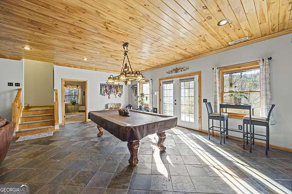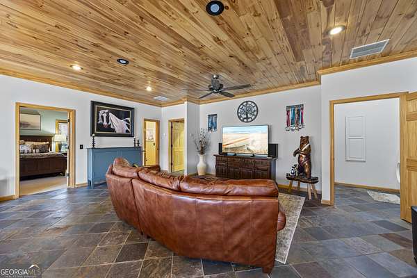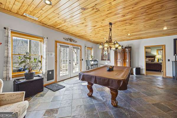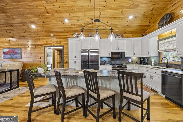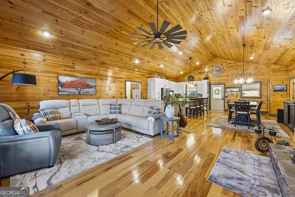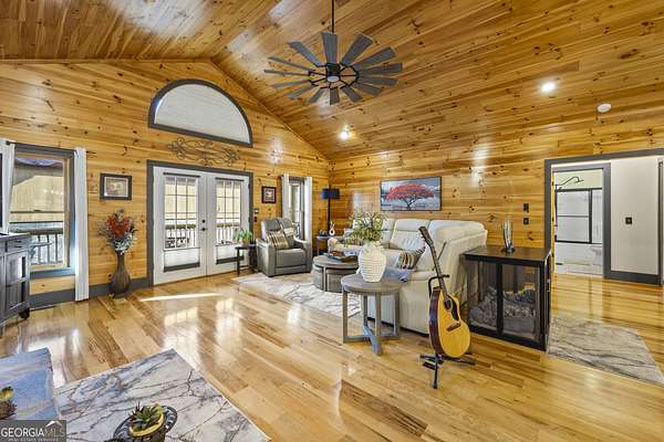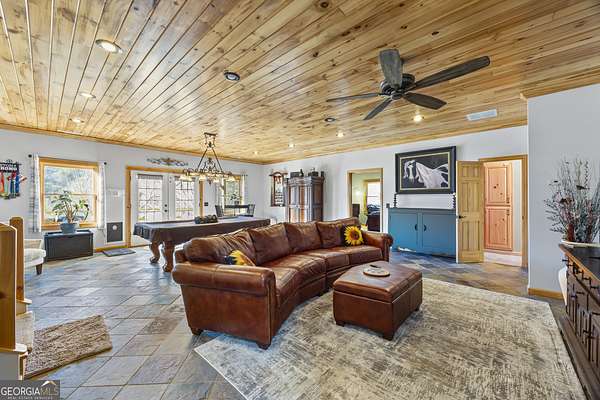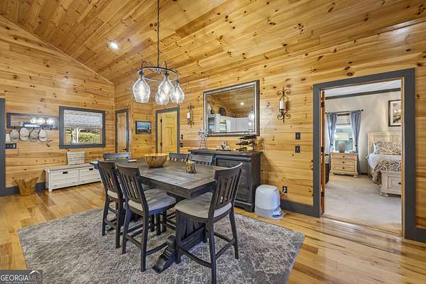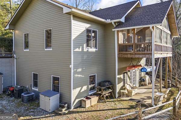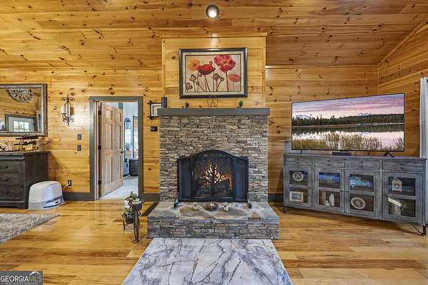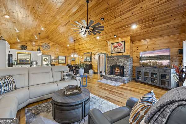 Welcome home to 299 Celestial Circle. Discover the perfect blend of mountain charm and modern luxury in this spacious five-bedroom, four-bathroom home, ideally located just minutes from downtown Clayton, Georgia. This exceptionally crafted, custom residence has been maintained and updated to the highest of standards. Designed for both relaxation and entertaining, the open-concept floor plan showcases vaulted tongue and groove ceilings, gleaming hardwood floors, and a beautiful stone fireplace that anchors the main living space. This extraordinary property features three master bedrooms, and two additional secondary bedrooms, offering flexibility for multi-generational living, guests, or large families. Thoughtfully designed interiors provide generous living areas, natural light, and seamless flow throughout the home. The updated kitchen with granite countertops, large island, and stainless steel appliances are sure to please the home chef. French doors in the living room lead out to a large screened-in porch, perfect for outdoor relaxing during nice weather. On the terrace level you will find a spacious living area with slate floors, family room, game room area, and two master suites on opposite sides of the house, providing privacy for your guests or family members. Step outside to find a three-car detached garage boasting an elevator that goes to the second floor area, perfect for extra storage of your outdoor gear and equipment. Below the garage you will discover the ultimate workshop, ideal for hobbyists or craftsmen. Whether you're seeking a full-time residence, a mountain retreat, or an investment property, this home delivers space, functionality, and an unbeatable location close to dining, shopping, and outdoor adventures in Rabun County. Mountain comfort and adventure meets everyday luxury- this is a home you will not want to miss!