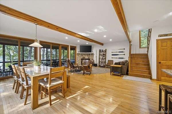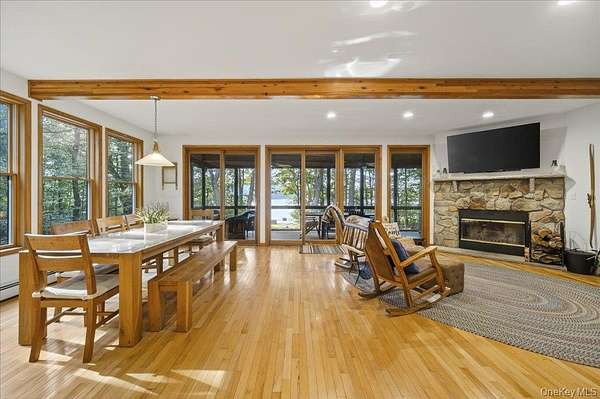 Inside, the home features a spacious rustic/modern layout with three bedrooms and two and a half bathrooms. The open-concept main living area is anchored by a warm wood-burning fireplace, creating a warm and inviting space for relaxing evenings or hosting guests. An opened island kitchen affords plenty of counter seating. In addition, an expansive dining table is perfect for large gatherings. The screened-in patio offers additional outdoor living space where you can take in the lovely lake views, enjoy morning coffee, or unwind to the sounds of nature. In the evenings, sit lakeside and enjoy the beautiful sunset view! Stylish, cozy decor throughout the home invites you to settle in and savor the simple joys of lakeside living.
