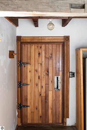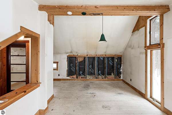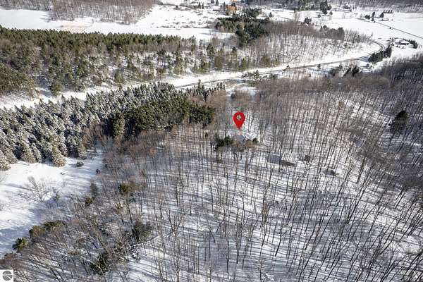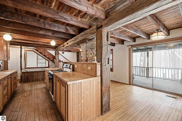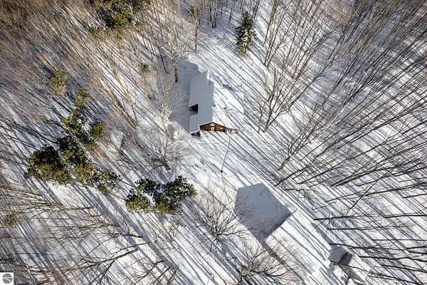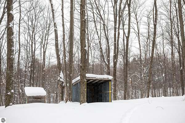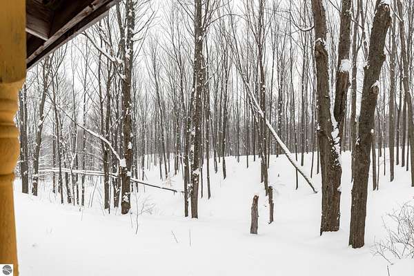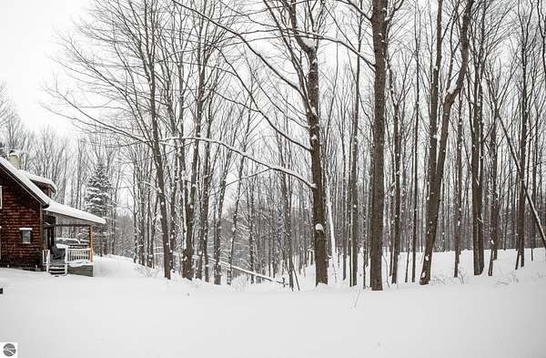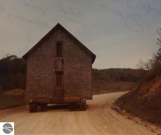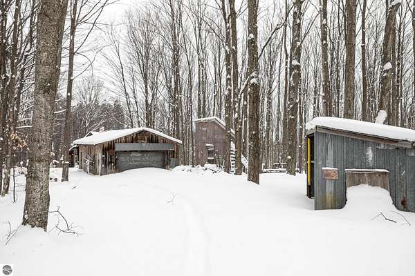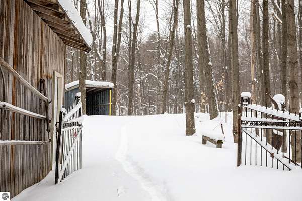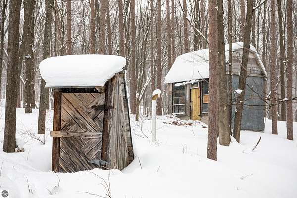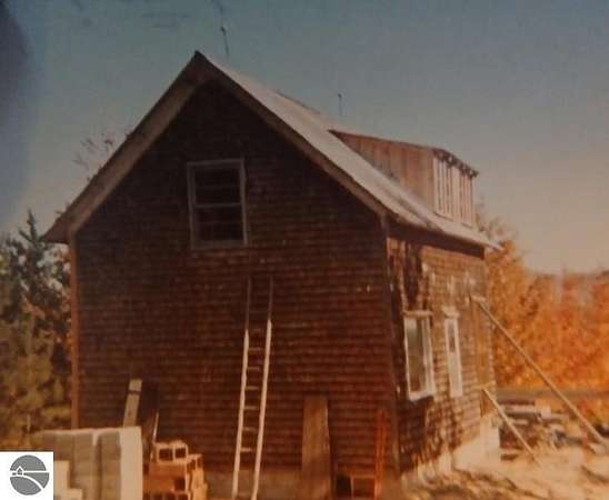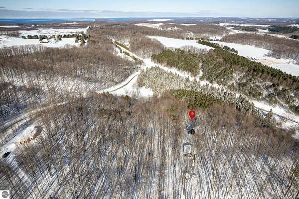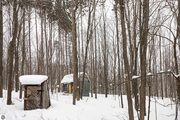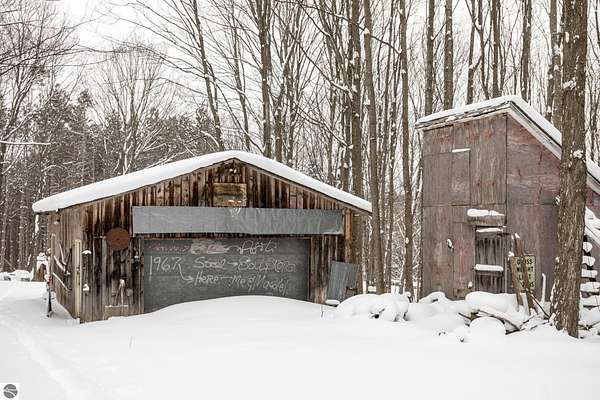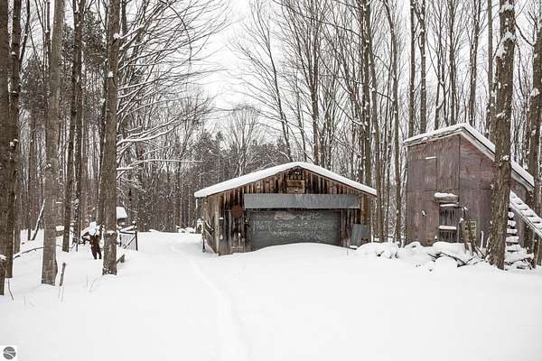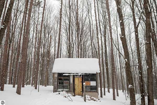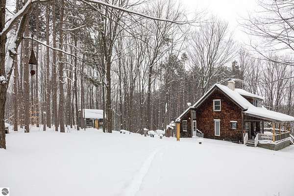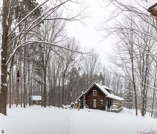 The beauty of a vision and a really big flatbed truck moved this circa 1900's granary building from a nearby farm to the growing Jackson family's 20 acres in central Leelanau County. A community then came together. Good friends, & sweat equity tag teamed to build this funky, eclectic, cottage on nearly 5 acres in the woods, where kids explored and roamed around the forest, parents gardened & created their art. Family memories were created. Exposed hand hewn post & beam frame is a testament to longevity, maple floors to durability, & the artistic use of wood, steel, & masonry to craft. Main level primary bedroom, two bedrooms on the upper level share the only bathroom. Time to create your own vision with imagination, a budget, and money well spent, to make this unique abode your special home. Large 9'x28' covered porch will be a welcomed spot for sipping coffee, enjoying the vast views of peaceful, rolling hills. A chicken coop adorned with repurposed building materials could be resurrected for producing hen fruit, maybe a studio, or a she shed. The added underground root cellar might serve in tandem as a place to keep precious wine. The 24x30 detached garage/workshop has lots of utility, but will need some attention. Certainly this gem is a fixer upper, but well worth the effort, to reawaken and create your own memories of kids sledding and tree climbing. A private driveway is shared with 2 other residences. An informal agreement is in place to share in snow removal/maintenance costs at this point, something more formal is possible. Point-of-sale waiver for a water analysis may be likely as the supply lines have been compromised due to improper winterization. Septic was pumped in 2020, and has not had much use since. Yard art and some items from the work shop/garage to be removed, but may need to happen after a sale. This is a one-of-a-kind property. Given the interest, highest and best offers will be reviewed after 4:00 PM 2/12/26.