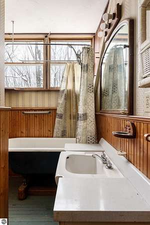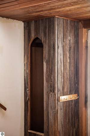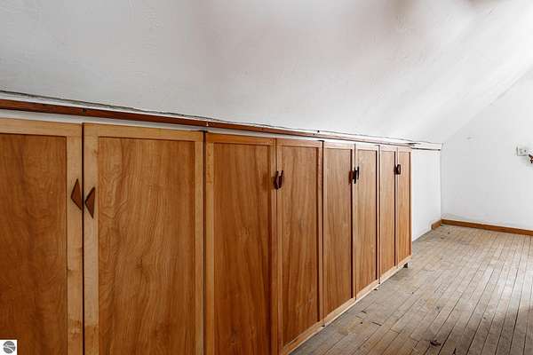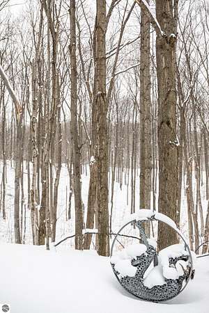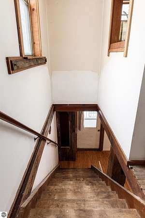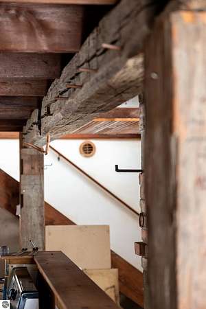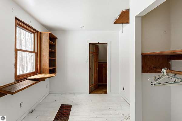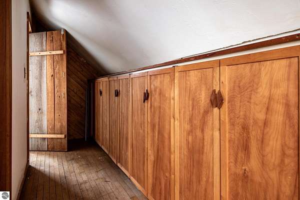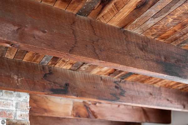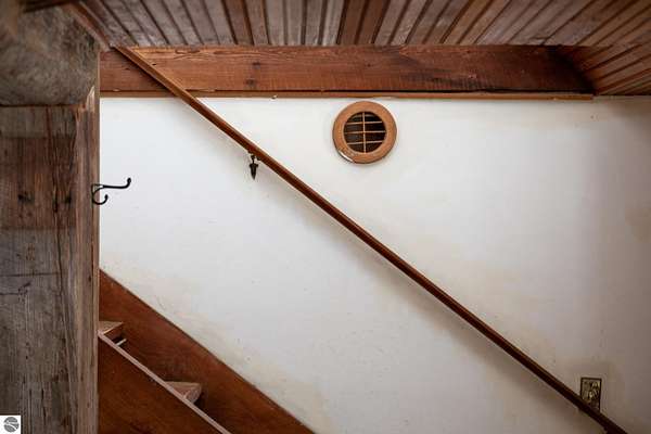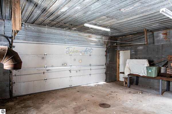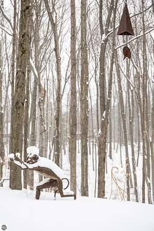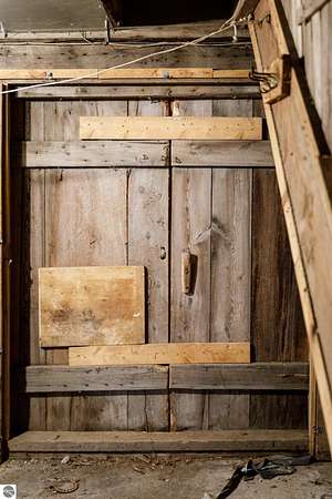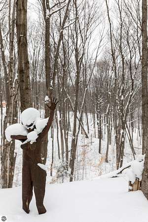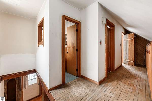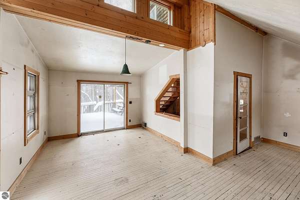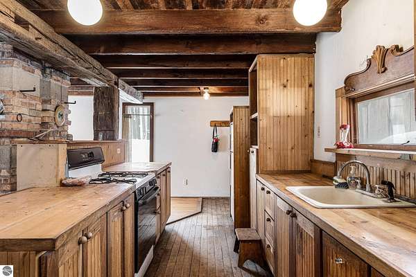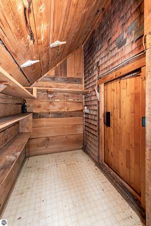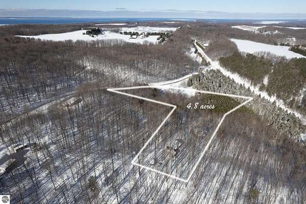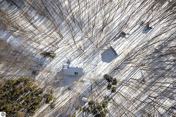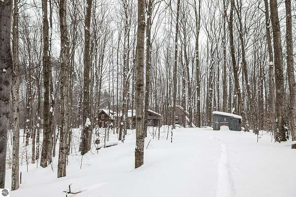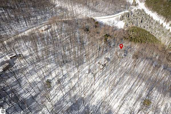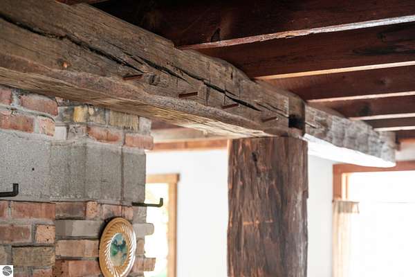 The beauty of a vision and a really big flatbed truck moved this circa 1900's granary building from a nearby farm to the growing Jackson family's 20 acres in central Leelanau County. A community then came together. Good friends, & sweat equity tag teamed to build this funky, eclectic, cottage on nearly 5 acres in the woods, where kids explored and roamed around the forest, parents gardened & created their art. Family memories were created. Exposed hand hewn post & beam frame is a testament to longevity, maple floors to durability, & the artistic use of wood, steel, & masonry to craft. Main level primary bedroom, two bedrooms on the upper level share the only bathroom. Time to create your own vision with imagination, a budget, and money well spent, to make this unique abode your special home. Large 9'x28' covered porch will be a welcomed spot for sipping coffee, enjoying the vast views of peaceful, rolling hills. A chicken coop adorned with repurposed building materials could be resurrected for producing hen fruit, maybe a studio, or a she shed. The added underground root cellar might serve in tandem as a place to keep precious wine. The 24x30 detached garage/workshop has lots of utility, but will need some attention. Certainly this gem is a fixer upper, but well worth the effort, to reawaken and create your own memories of kids sledding and tree climbing. A private driveway is shared with 2 other residences. An informal agreement is in place to share in snow removal/maintenance costs at this point, something more formal is possible. Point-of-sale waiver for a water analysis may be likely as the supply lines have been compromised due to improper winterization. Septic was pumped in 2020, and has not had much use since. Yard art and some items from the work shop/garage to be removed, but may need to happen after a sale. This is a one-of-a-kind property. Given the interest, highest and best offers will be reviewed after 4:00 PM 2/12/26.