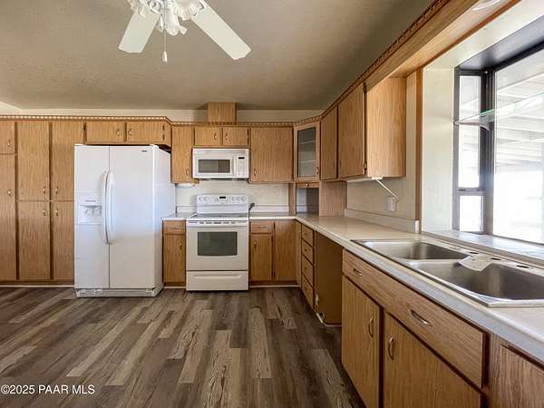 HUD Home. Rare opportunity in Chino Valley! This expansive 5 bedroom, 5 bath home offers 4,314 sq ft of flexible living space on 3.64 acres of usable horse property. Perfectly designed for generational living, the layout includes three separate living areas under one roof, each with its own kitchen. Whether you're accommodating extended family, long-term guests, or exploring rental potential, this home offers the space and versatility to meet your needs.The main living quarters feature a spacious kitchen, formal dining room, and multiple gathering areas ideal for entertaining or everyday living. The in-law suite includes private entry options, its own kitchen, and comfortable living quarters. A third living space adds even more flexibility for independent living.