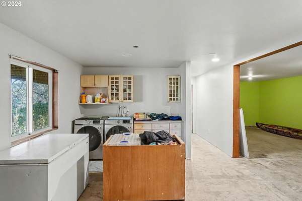 - Concrete Floor, Laminate Flooring, Laundry, Soaking Tub, Washer Dryer