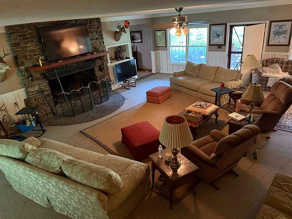 The two-story home includes 4 bedrooms, central heat and air, a fireplace, and welcoming outdoor living spaces including a screened-in porch and a front porch perfectly positioned to overlook the pond and valley beyond. It serves equally well as a full-time residence, weekend getaway, or premier hunting lodge.