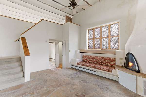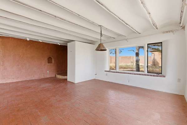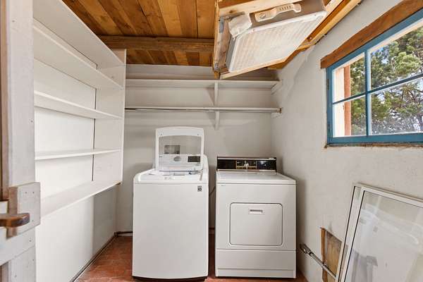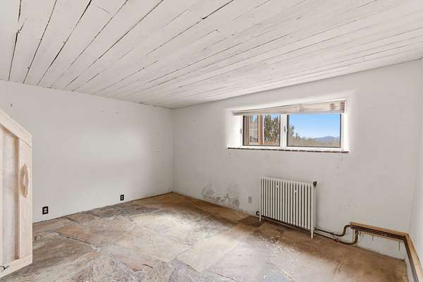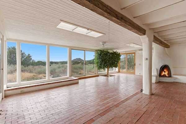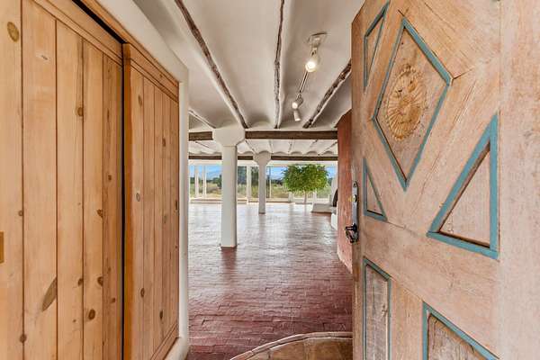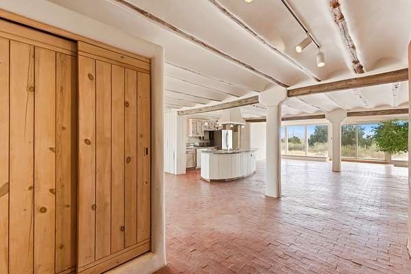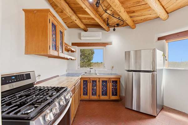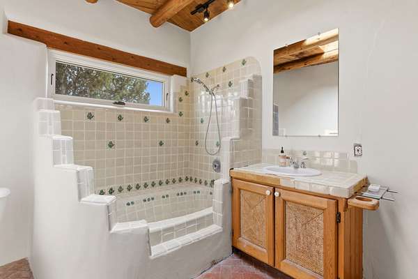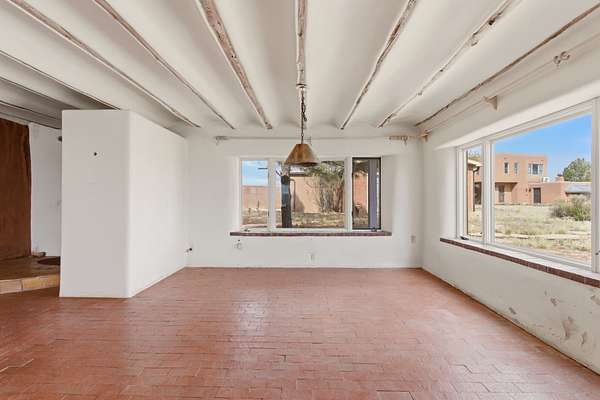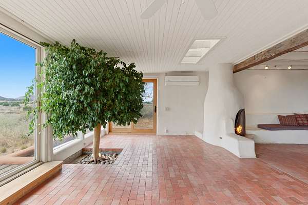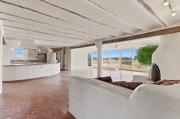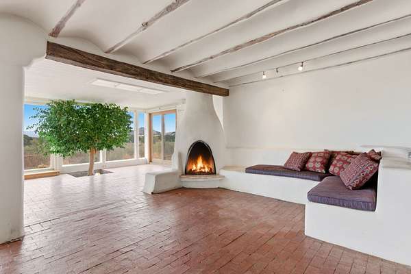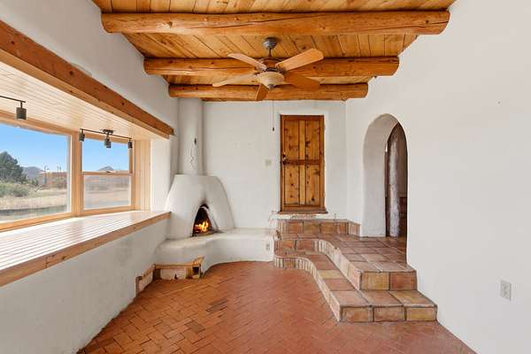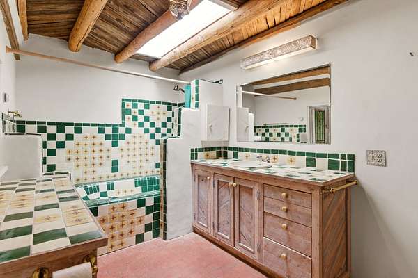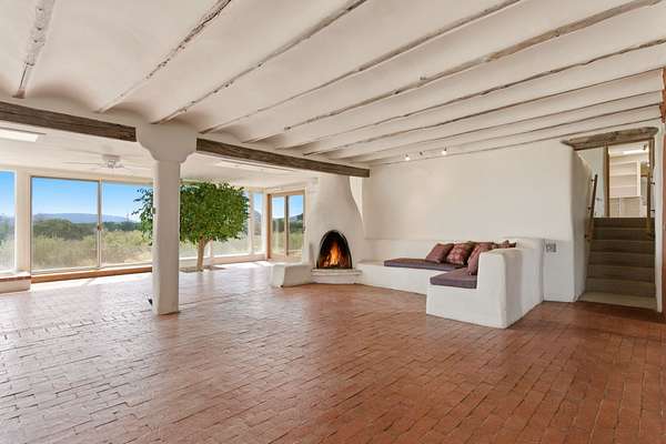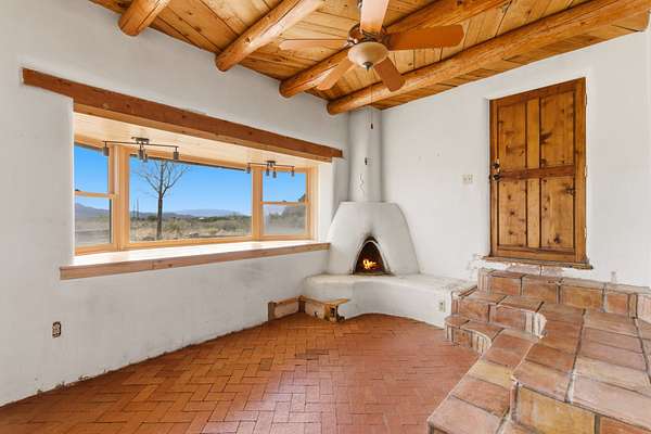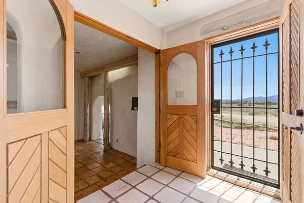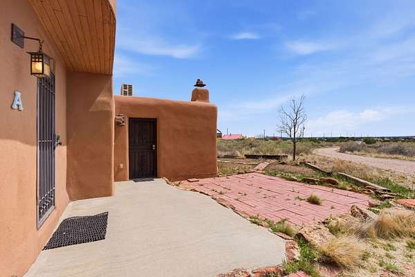 Set on 5 private acres, this unique Santa Fe property offers a main home, guest house, and an incredible garage/workshop-perfect for multi-generational living, rental potential, or a live/work lifestyle. Horses are welcome and there's no HOA giving you space, flexibility, and freedom while still being close to town amenities. The main house is a spacious split-level home filled with classic Santa Fe charm. The main level features an open kitchen, dining, and living area with warm brick floors, coved ceilings, and a wood-burning kiva fireplace. Wall-to-wall windows capture stunning western mountain views, while the kitchen's large island and open plan make entertaining easy. The upper level hosts the primary suite with a generous walk-in closet and a spa-like bath. On the lower level, you'll find a cozy sitting room or office with a gas kiva fireplace and the home's second bedroom. A colorful shared bathroom with large soaking tub adds personality and warmth. The guest house is a character-filled multi-level home with attached carport. The main level includes the kitchen, dining, and sitting areas along with the primary bedroom, featuring a walk-in closet and ensuite bath with large soaking tub. Throughout the home you'll find custom carved wood doors, diamond plaster walls, and a mix of brick and Saltillo tile flooring. Upstairs offers another bedroom, bathroom, and additional living space with expansive mountain views. The upper level flooring is ready for your personal finishing touches. The detached garage/workshop is a dream for hobbyists and professionals alike, offering three garage bays, an additional covered carport, abundant storage, and a dedicated workspace. Equipped with a 60-gallon central pneumatic compressor system and central vacuum system, this space is ready for projects of all kinds. With horse-friendly acreage, wide-open space, and endless possibilities, this special property captures the spirit of Santa Fe living. Being sold AS-IS.