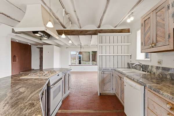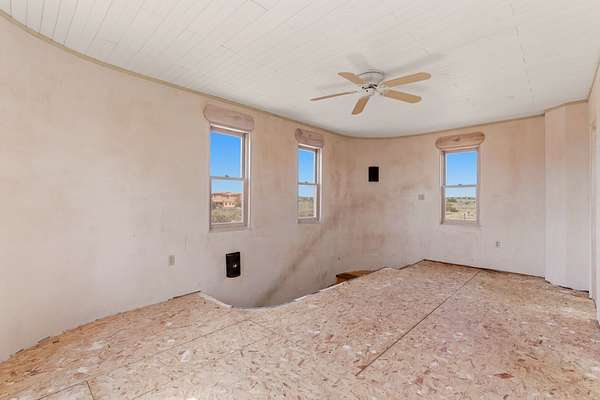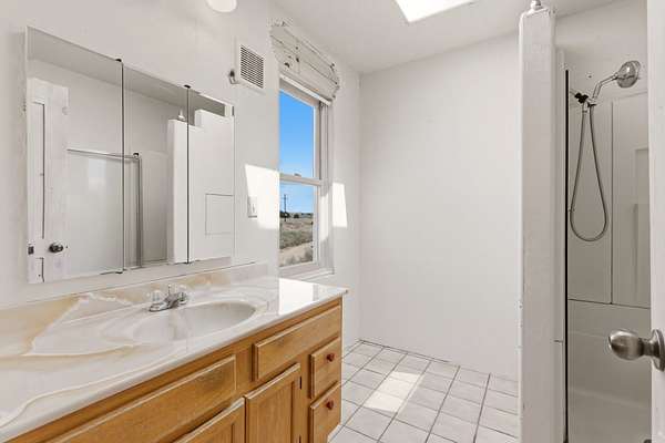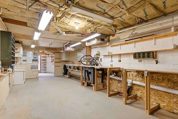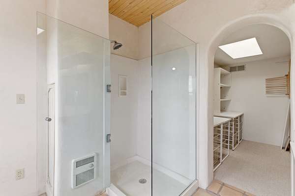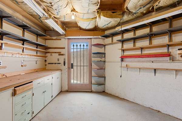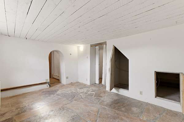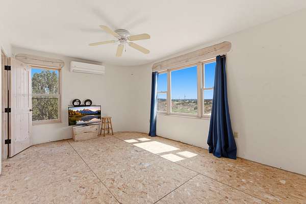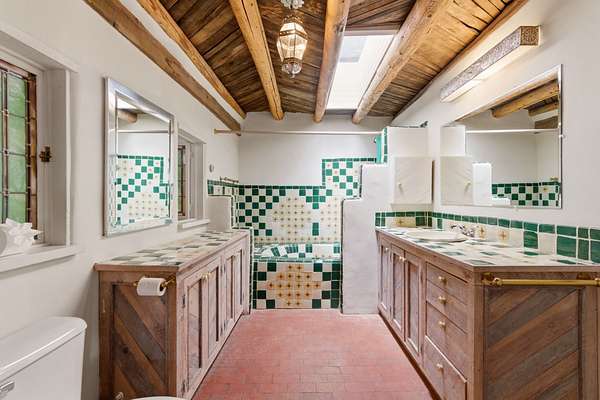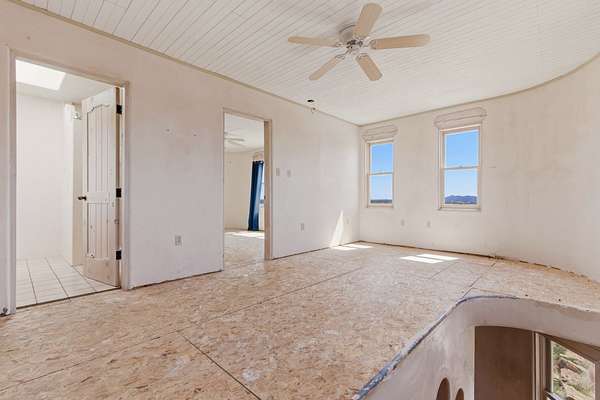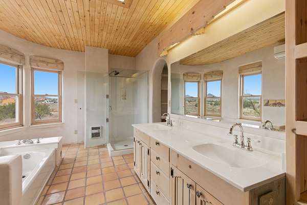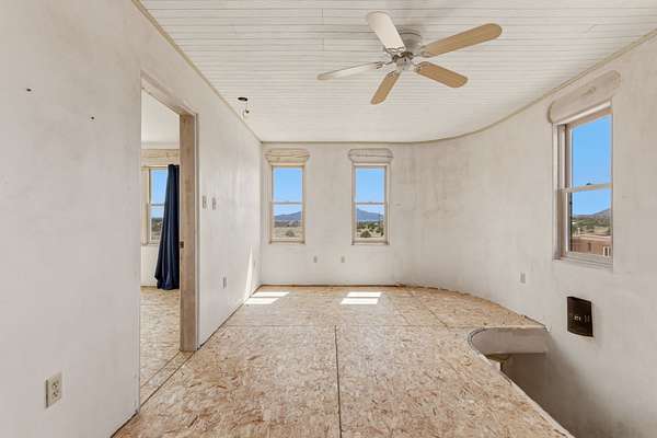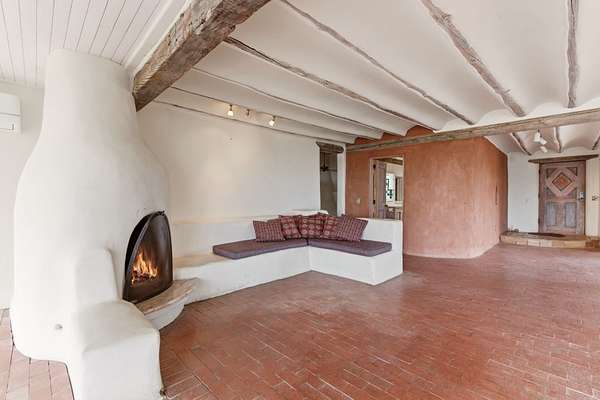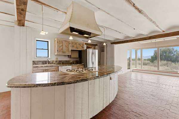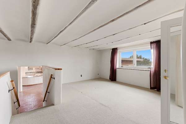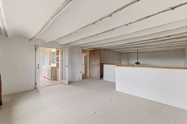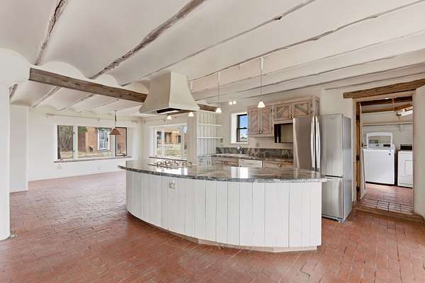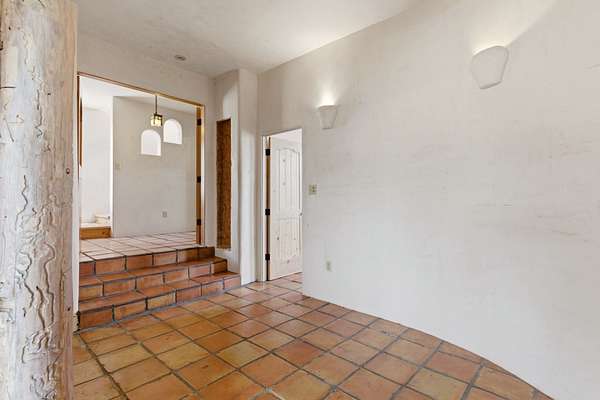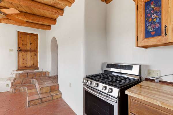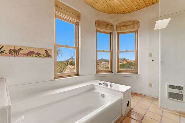 Set on 5 private acres, this unique Santa Fe property offers a main home, guest house, and an incredible garage/workshop-perfect for multi-generational living, rental potential, or a live/work lifestyle. Horses are welcome and there's no HOA giving you space, flexibility, and freedom while still being close to town amenities. The main house is a spacious split-level home filled with classic Santa Fe charm. The main level features an open kitchen, dining, and living area with warm brick floors, coved ceilings, and a wood-burning kiva fireplace. Wall-to-wall windows capture stunning western mountain views, while the kitchen's large island and open plan make entertaining easy. The upper level hosts the primary suite with a generous walk-in closet and a spa-like bath. On the lower level, you'll find a cozy sitting room or office with a gas kiva fireplace and the home's second bedroom. A colorful shared bathroom with large soaking tub adds personality and warmth. The guest house is a character-filled multi-level home with attached carport. The main level includes the kitchen, dining, and sitting areas along with the primary bedroom, featuring a walk-in closet and ensuite bath with large soaking tub. Throughout the home you'll find custom carved wood doors, diamond plaster walls, and a mix of brick and Saltillo tile flooring. Upstairs offers another bedroom, bathroom, and additional living space with expansive mountain views. The upper level flooring is ready for your personal finishing touches. The detached garage/workshop is a dream for hobbyists and professionals alike, offering three garage bays, an additional covered carport, abundant storage, and a dedicated workspace. Equipped with a 60-gallon central pneumatic compressor system and central vacuum system, this space is ready for projects of all kinds. With horse-friendly acreage, wide-open space, and endless possibilities, this special property captures the spirit of Santa Fe living. Being sold AS-IS.