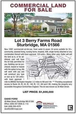 * New 1000' commercial cul-de-sac * Town water & sewer. 54 acres, 25 acres suitable for development. Zoned for market rate OSRD, 55+ community, assisted living, nursing home, hospital, 40B, single family attached, SF rental or any combination thereof with town approval. -- 180 units+. Seller will sell the land as is, or for additional cost will have the lot fully permitted for you. Building can be purchased, leased or leased with the option to buy. Once you are qualified, we will quote a custom bldg. for you. We will work with you and will construct any type or size up to 180 units+ with town approval. 1 mile to UMASS Harrington Hospital. 2.5 miles to I90 and I 84. *** Providing exceptional access to Route 49, Rt. 20, Rt. 148, Rt. 131, I84 and I 90 This lot was known as 30 Main Street. Also 4.4 acres available with 965 feet of frontage. . Southern Worcester county has a great need for 55+ apartment rentals and assisted living.