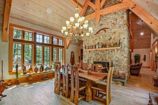 The Dining Room and Living Room focus is the Floor to Ceiling Wood-burning Stone Fireplace, hand crafted by a 3rd Generation European Stone Mason, .....Santa will be proud to slide down that Chimney and fill all the Stockings hung there during the Holidays.