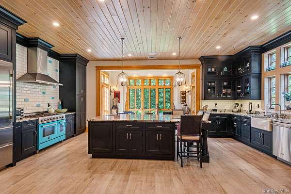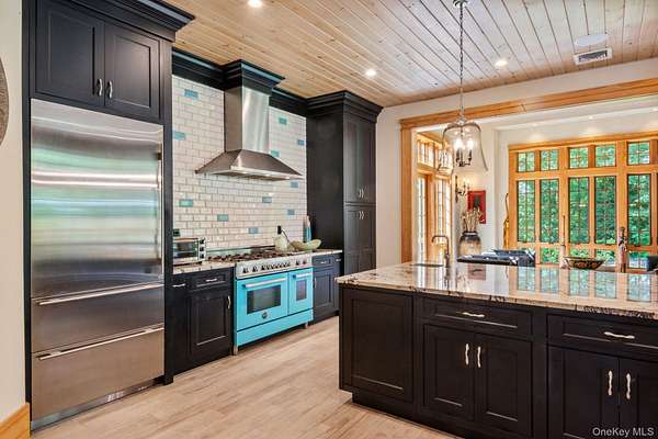 The Center Island Kitchen is the Heart of this Home and has Top Shelf Appliances, including a Bertazzoni Stove/Oven, Sub Zero Frig, Cabinetry Galore and Counterspace that will awe any Chef.