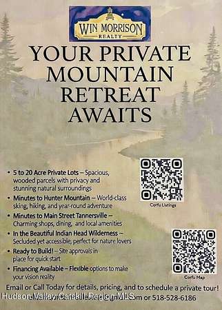 The perfect retreat property for your dream mountain escape in the Heart of the Catskills. Multiple lots tucked away down a quiet private road off Platte Clove, in the legendary Indian Head Wilderness. Surrounded by beautiful pines, historic stone walls, and stunning mountain ridgelines, it's where memories with family and friends will be made for generations to come. The costly and hard work is already done... engineered plans with surveys are ready, and power is available at the road. All you need to do is carve out your driveway, clear your lot, and start building!! Location is pristine being minutes from: - The Hunter Mountain Ski Resort. - World Renowned Kaaterskill Falls. - The Charming Villages of Tannersville and Hunter (Great restaurants, Breweries, and Shops). - Endless hiking trails, swimming holes, and State Parks and Lakes. This spot is remote enough to feel like a true escape, yet close enough to enjoy everything the Catskills has to offer. Properties like this are rare. Once they're gone, they're gone. If you've been dreaming of that perfect mountain getaway your family will love for years to come, this is your chance.