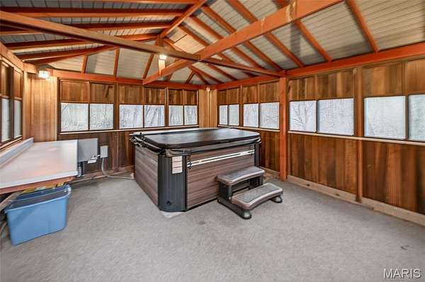The full finished walk-out basement expands the living space and includes a second masonry fireplace—ideal for gatherings, relaxation, or extended living options. Outdoor living shines with open ground for gardening or recreation, a dedicated garden area, and a separate enclosed gazebo with a hot tub for year-round enjoyment.