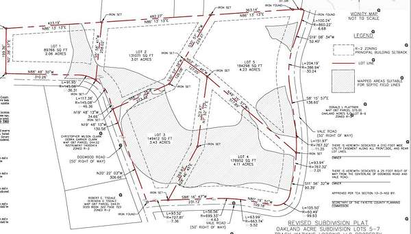 Beautiful 2-4 acre building lots on Dogwood and Vale Road in Somerville, right on the edge of Oakland. These wooded lots offer a perfect mix of privacy, natural beauty, and convenience--only minutes from schools, shopping, and restaurants in Oakland. Gently rolling terrain with scattered mature hardwoods and excellent building sites. Gated entrance, Cedar split-rail fencing along the road frontage and barbless wire fencing on the interior property lines provide a clean, country look. Electric, natural gas, and high-speed internet are available at the road. Buyer to install well and septic. Perc testing complete, Lot 1 approved for 3 BD, Lots 2-5 approved for 4 BD homes. Lots range from 2.32 to 4.13 acres. Enjoy quiet rural living with quick access to town--ideal for your dream home in Fayette County.