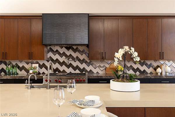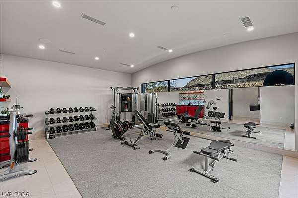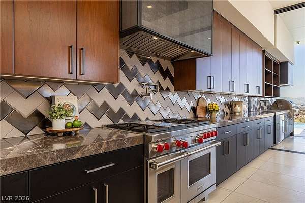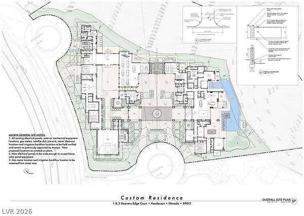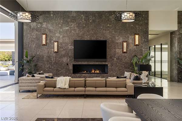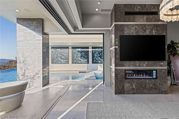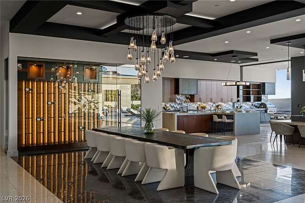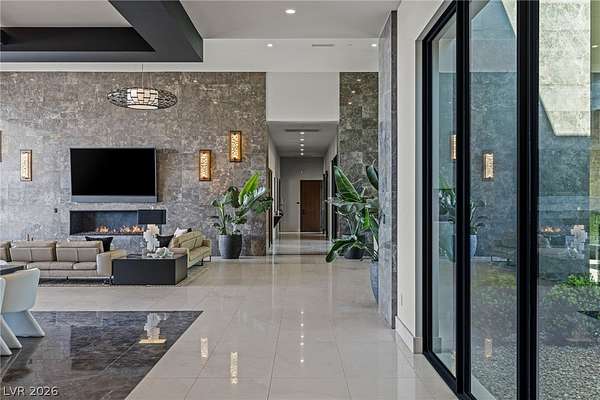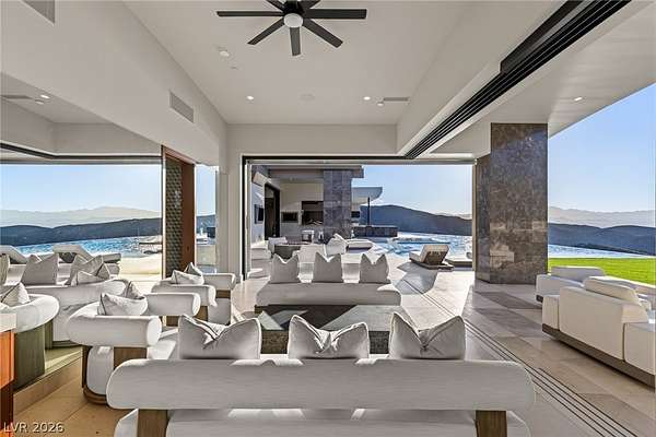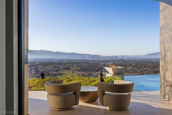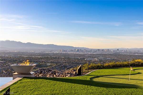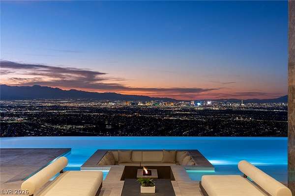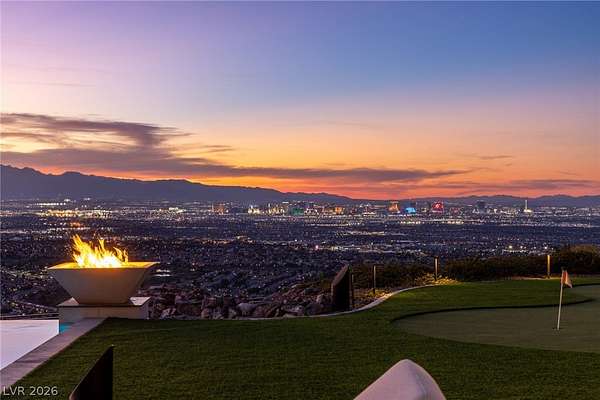 Set behind the guard gates of Ascaya, this extraordinary single-story estate crowns the mountains of Henderson with commanding, unobstructed views of the Las Vegas Strip, valley, and surrounding peaks. Perched on an expansive 4.22-acre hillside with a dramatic cliffside backdrop, this 9,588± sq ft residence by Sun West Custom Homes is a masterclass in timeless contemporary design. Warm and cool tones blend effortlessly, creating a refined yet inviting atmosphere throughout. Featuring 6 bedrooms with optional 7th, 9 baths, a private casita, gym, study, and 6-car split garage, the home is designed for both grand entertaining and everyday luxury. Expansive pocket doors dissolve the boundary between indoors and out, revealing resort-style grounds with a pool, spa, cold plunge, fire features, putting green and outdoor kitchen. With solar, smart home integration, and room to expand or create a private compound, this is a rare expression of elevated desert living.