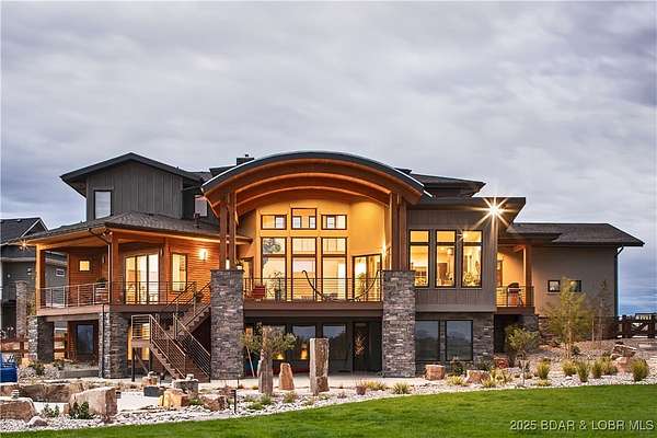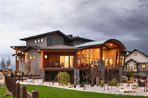 Luxury pre-construction opportunity in one of Lake of the Ozarks' most exclusive new communities. Set on a private 5+ acre homesite within a 220-acre development limited to just 30 homes, this stunning modern mountain-lake residence offers a rare blend of space, privacy, and resort-style living. Thoughtfully designed with dramatic rooflines, expansive windows, and premium stone and wood finishes, the home seamlessly connects indoor and outdoor living with covered terraces and generous entertaining spaces. Residents enjoy exceptional amenities including a private indoor/outdoor pool, clubhouse, and an impressive 8,000 sq ft event center-ideal for private gatherings and celebrations. Estate-sized lots ensure unmatched privacy while maintaining convenient access to Lake of the Ozarks attractions. Pre-construction allows potential for customization and the opportunity to secure early ownership in a truly limited offering. Ideal as a full-time residence, luxury second home, or legacy property. Don't miss this fantastic full time home, vacation home, or investment property as neighboring homes are bringing in GREAT rental numbers!