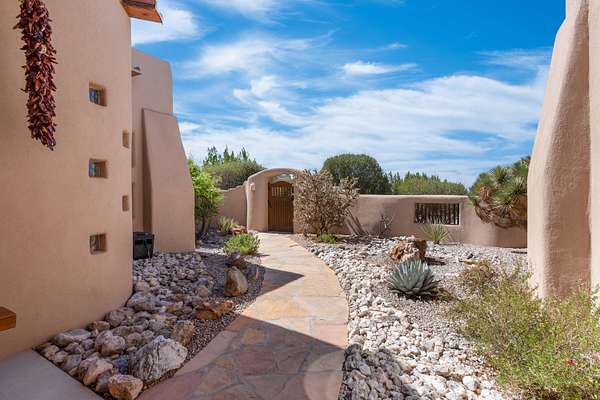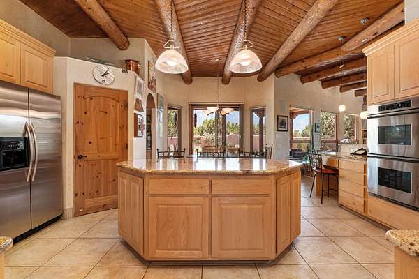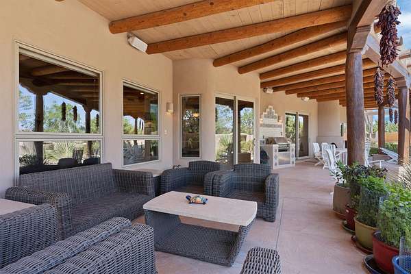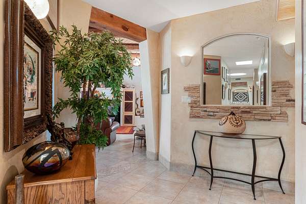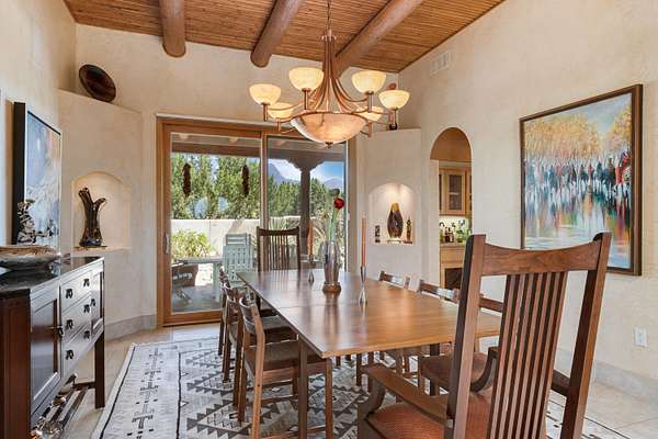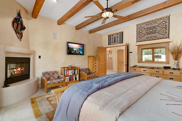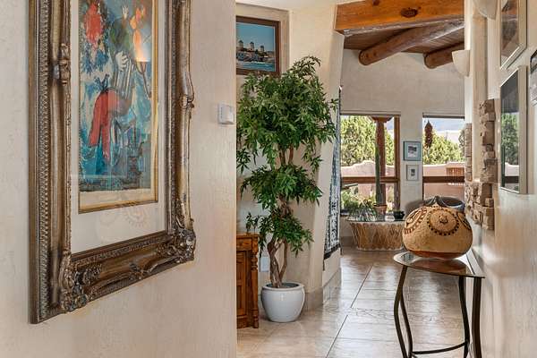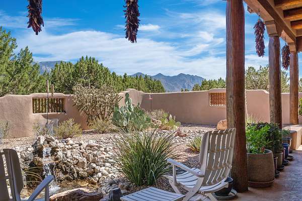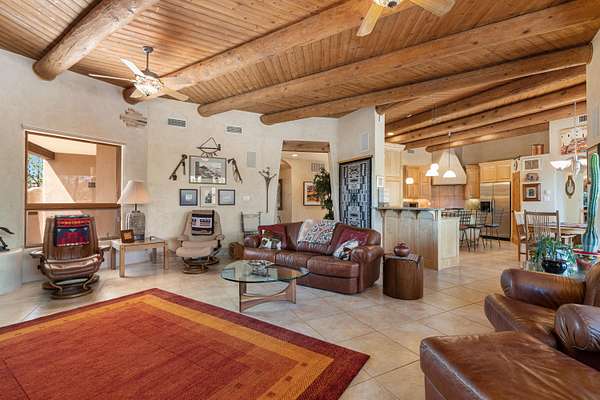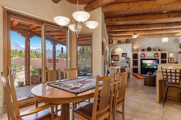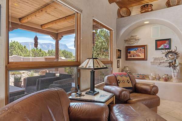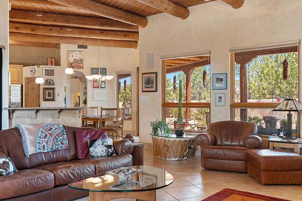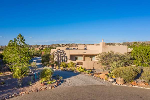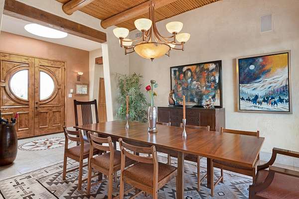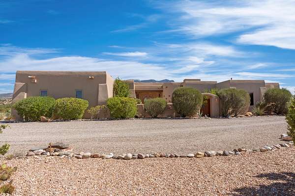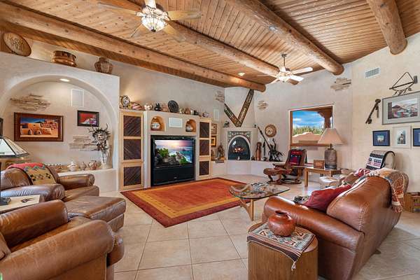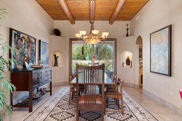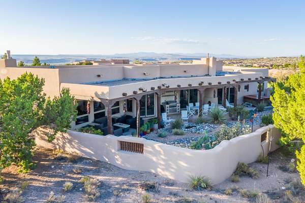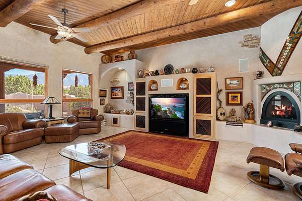 Anasazi Trails Custom Home with Stunning VIEWS, Situated on an approximately 1.7 Acre cul-de-sac lot! 4th bedroom potential as there is a large study/office with a closet! Bring your most discerning buyer to this beautifully maintained property which features a split master floorplan with exceptional appointments throughout, including Pella windows w/custom Hunter Douglas window treatments; diamond plaster wall accents; exposed beamed ceilings with tongue & grove, latillas; bancos & nichos; custom gas log Kiva fireplaces & so much more! The grand entrance through stunning Artisan double doors, opens to the elegant formal dining room-ideal for entertaining; continue down the hall to the lavish Living/Great Room with raised ceilings, a corner Kiva fireplace, & wall of windows