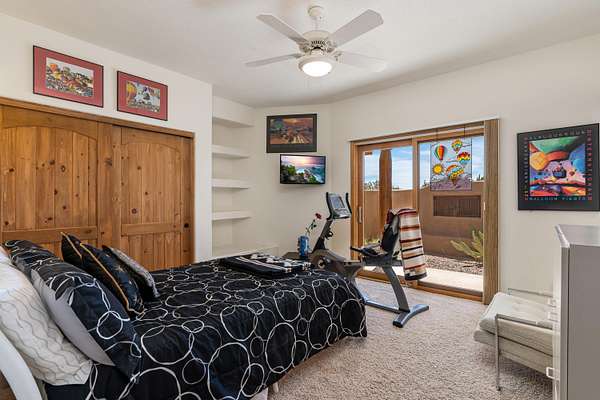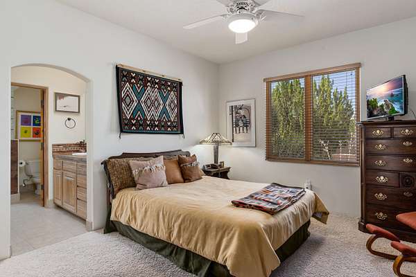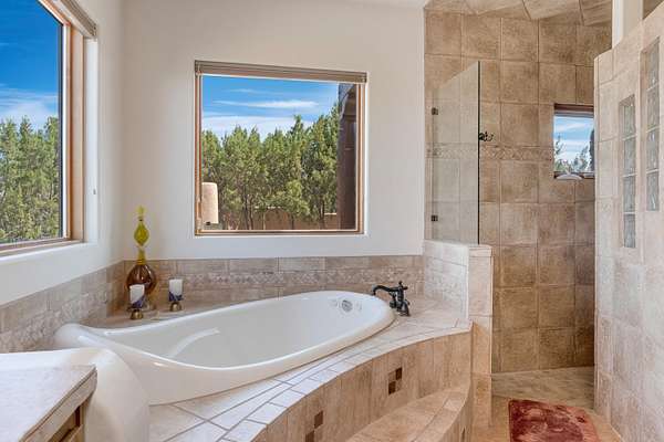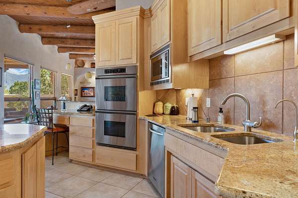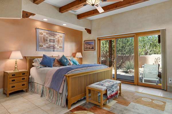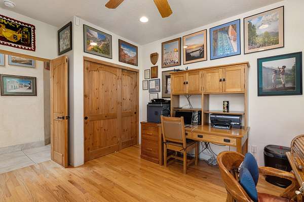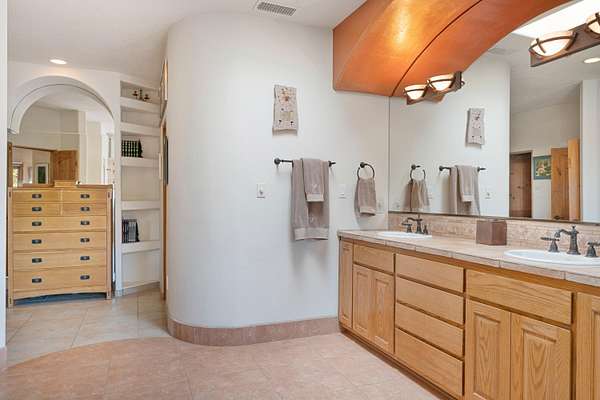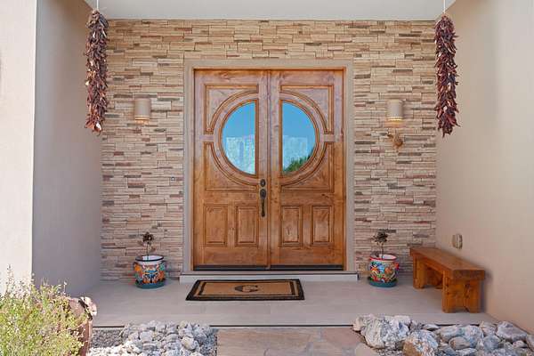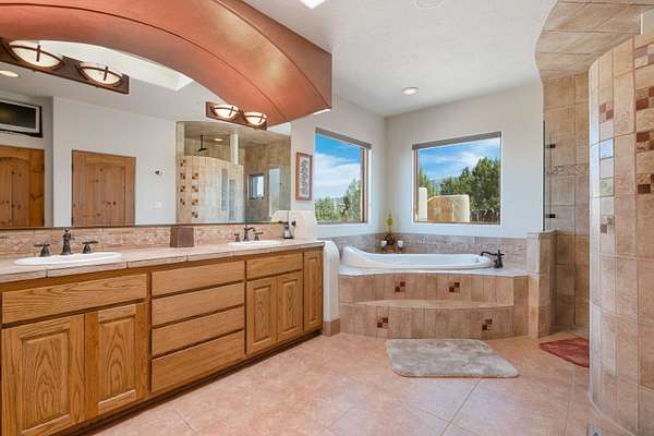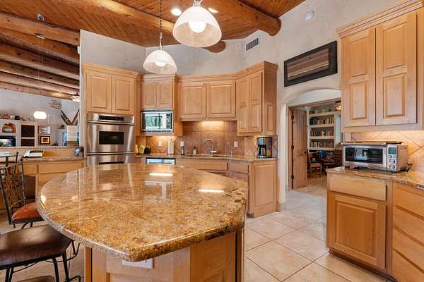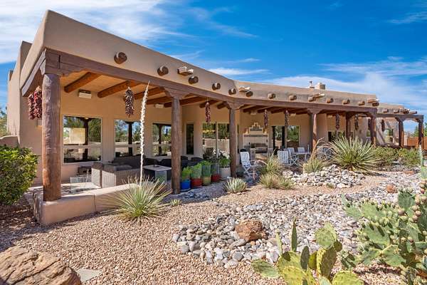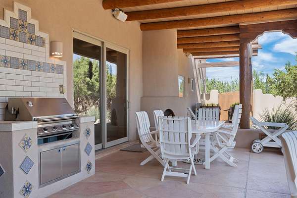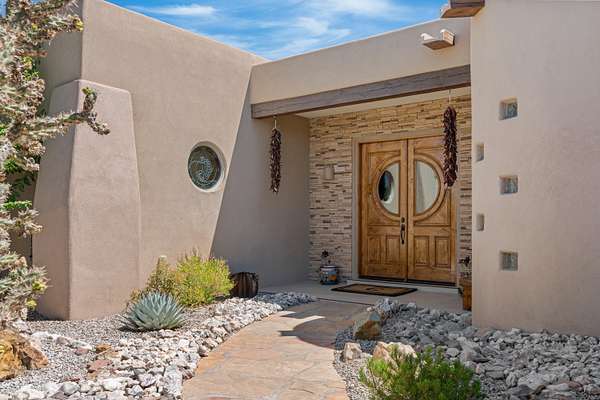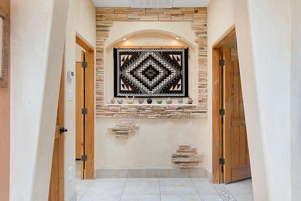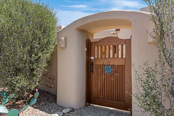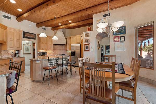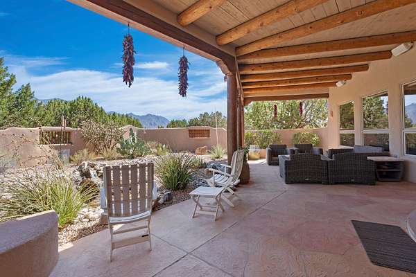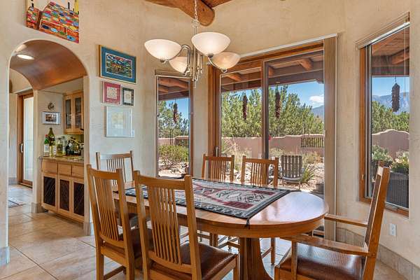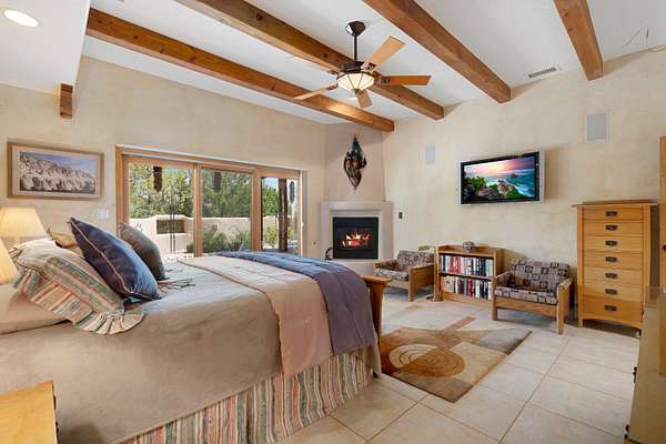 Anasazi Trails Custom Home with Stunning VIEWS, Situated on an approximately 1.7 Acre cul-de-sac lot! 4th bedroom potential as there is a large study/office with a closet! Bring your most discerning buyer to this beautifully maintained property which features a split master floorplan with exceptional appointments throughout, including Pella windows w/custom Hunter Douglas window treatments; diamond plaster wall accents; exposed beamed ceilings with tongue & grove, latillas; bancos & nichos; custom gas log Kiva fireplaces & so much more! The grand entrance through stunning Artisan double doors, opens to the elegant formal dining room-ideal for entertaining; continue down the hall to the lavish Living/Great Room with raised ceilings, a corner Kiva fireplace, & wall of windows