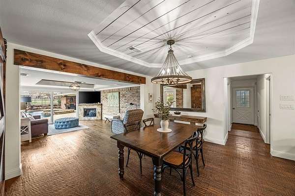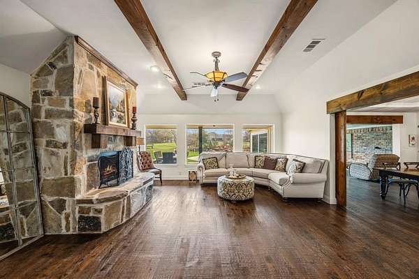 The 5-bedroom, 3-bath main home features two spacious living areas that can be opened or closed off with stunning custom woodworking barn doors. Interior highlights include hand-scraped hardwood and luxury vinyl floors, gorgeous exposed wood beams, shiplap accents in the living room and dining room ceiling, and two beautiful stone fireplaces. The home also features fresh paint throughout and new rear windows installed in 2025.