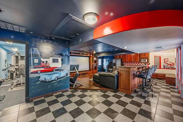 The detached guest house offers a media room, full bathroom, gym space, and kitchenette, making it perfect for extended family, long-term guests, or a private retreat.