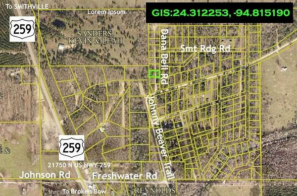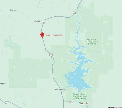 11.4 miles N' of Hochatown (North of Broken Bow) - Turn Right @ TruckinGood BBQ (21720 N Hwy 259) onto Johnny Beavers Trail - Take first left, road bends right & then take 2nd left Dana Bell Rd.
