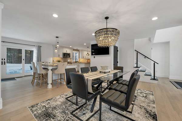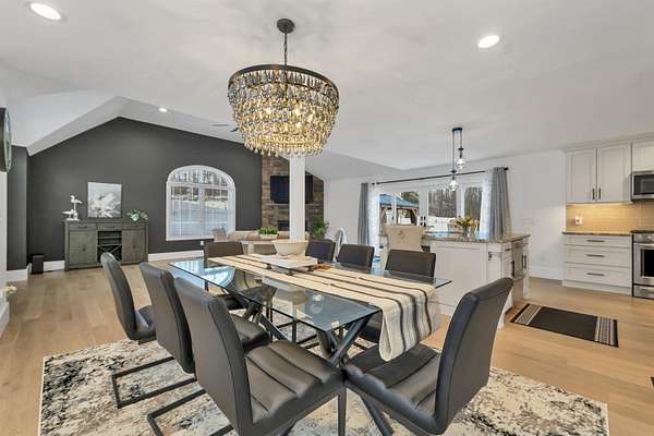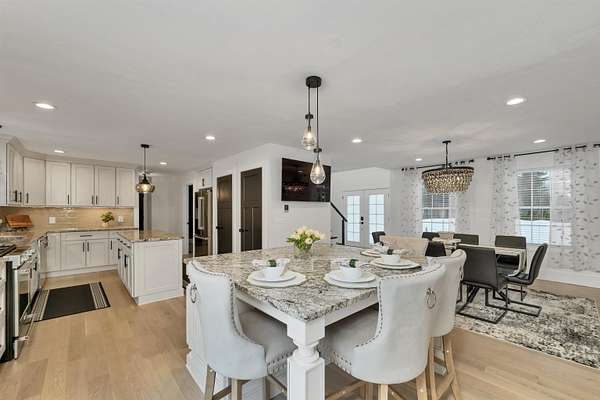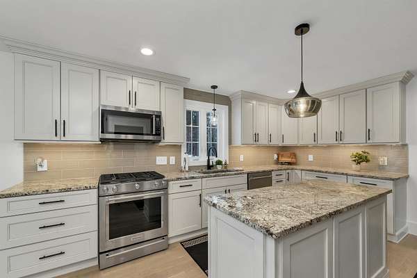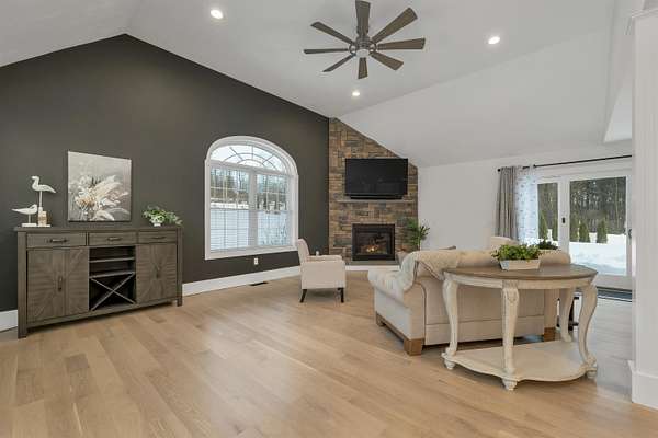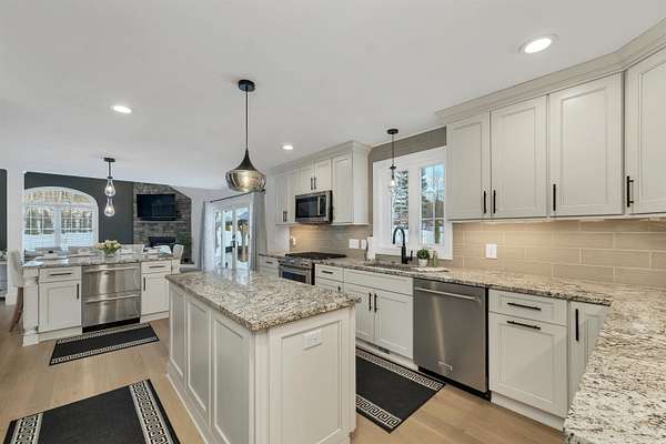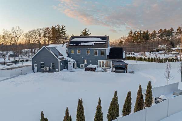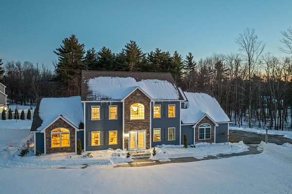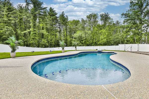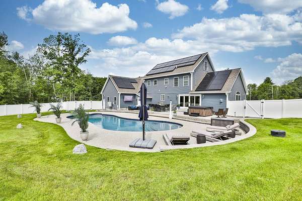 Nestled in the charming town of Atkinson, this stunning young Colonial sits on a private, lushly landscaped 2.35-acre lot. A babbling granite fountain, newly refinished driveway, and five granite lampposts create striking curb appeal. Inside, a bright open-concept floor plan features new white oak floors throughout the first level. The great room is anchored by a handsome stone fireplace with a dramatic backdrop. The chef's kitchen showcases custom white maple cabinetry, Alaska White granite, stainless steel appliances, a center island, and an oversized 5'x5' bonus island with dual beverage coolers and seating for four. A flexible first-floor office or bedroom is located near a 3/4 bath. Upstairs offers two guest bedrooms, a full bath, and a luxurious primary suite with dual vanities, soaking tub, oversized custom shower, and walk-in dressing closet. The third floor adds a fifth bedroom or office with a half bath. The finished lower level includes a wet bar, media and gaming areas, custom lighting, and another half bath. Outdoors, enjoy a heated Gunite pool, hot tub, patio, built-in grilling station, and vinyl fencing. The three-bay garage offers optional heating/cooling and car-lift height. Additional highlights include $62,000 in seller-owned solar panels, irrigation well, Sonos system, Lutron outdoor lighting, Eero WiFi, generator, new hybrid heating system, security cameras, brand-new Jacuzzi, new fencing with gated driveway, and 145 arborvitaes creating exceptional privacy. A home with upgrades too numerous to list--schedule your private showing today.
