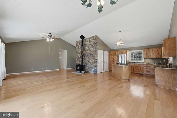 - Ceiling Fan(s), Combination Kitchen/Dining, Dining Area, Entry Level Bedroom, Open Floor Plan, Primary Bath(s), Tub Shower Bathroom, Upgraded Countertops, Walk-In Shower Bathroom, Water Treat System, Window Treatments, Wood Floors, Wood Stove