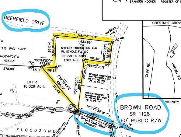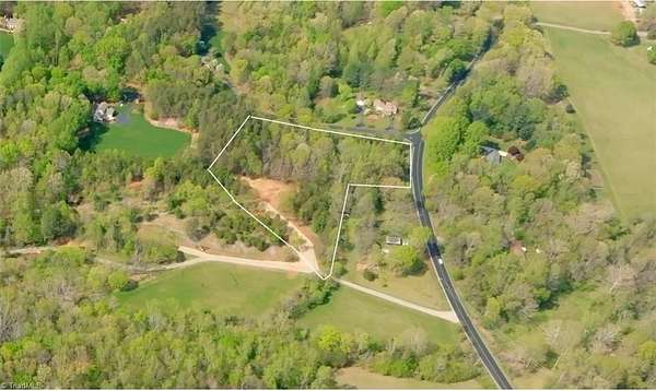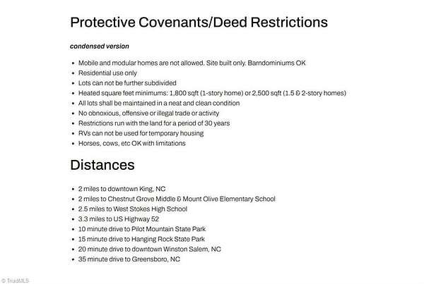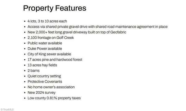 Bordering the King city limits, this 3-acre Stokes County lot offers public water and gravity sewer access, a newly cleared building site, 315’ private driveway, creek, and mature hardwood forest. Features include 591’ of frontage on two public roads plus a shared private drive (Thomas Farm Rd), a flat garden area across the creek bordering Brown Road, and protective covenants permitting stick-built or Barndominium construction. No HOA. The lot will comfortably accommodate a slab, crawlspace, or basement foundation. Ideally located within 2.5 miles of King’s elementary, middle, and high schools, just 2 miles from downtown King, and 20 minutes to Winston-Salem.
