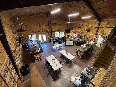 The 40x85 barn has a loft and storage. It is 2 stories and 40x 50 of it is enclosed. Building has a 300 sq ft bunk room with 6 beds, 8 individual rooms 60 sq ft each with 1 bed each, 183 sq ft loft with 6 beds, horse stall of 136 sq ft, 136 sq ft wet room/kitchen/dry storage, 190 sq ft game cleaning room enclosed, and 288 sq ft covered outdoor game cleaning area.
