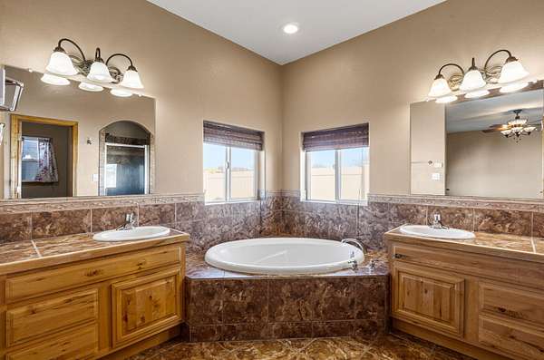 - Beamed Ceilings, Ceiling Fans, Dual Sinks, Family Dining Room, Garden Tub Roman Tub, High Ceilings, Kitchen Island, Living Dining Room, Main Level Primary, Pantry, Separate Formal Dining Room, Separate Shower, Walk In Closets