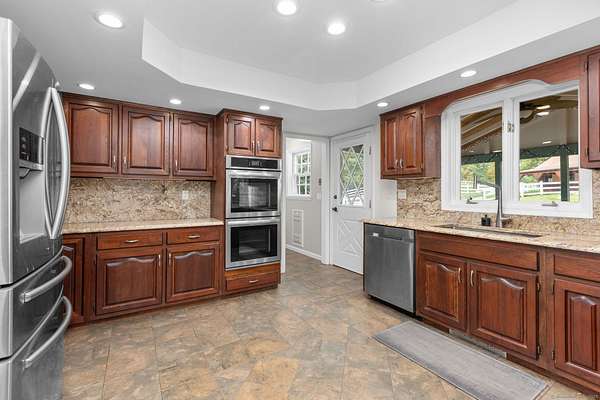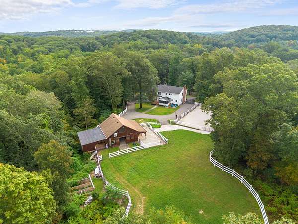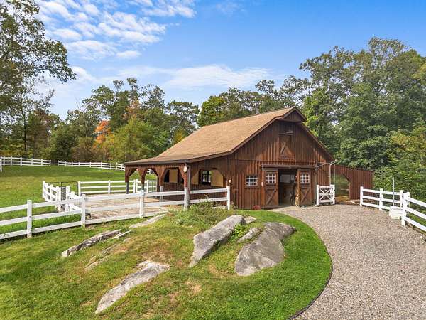 Tucked away at the end of a quiet cul-de-sac in one of New Fairfield's westside neighborhoods, this exceptional 5.08-acre equestrian property offers the perfect blend of rural tranquility, modern comfort, and functional design. Ideal for horse lovers, hobby farmers, or anyone seeking privacy and open space, the property features a professionally equipped three-stall barn with 10x10 matted stalls, individual walkouts, hay drops, a spacious loft with fan for hay and bedding storage, a tack/feed room with private changing area and sink, an outdoor wash station, and a dedicated space for a portable toilet. The grounds are thoughtfully laid out with a sand riding ring, several paddocks, and a turnout field, all surrounded by peaceful woods, offering both beauty and practicality. The stunning four-bedroom, 2.5-bath Colonial home has been tastefully updated with fresh paint and newer flooring throughout, and offers a large eat-in kitchen with top-of-the-line stainless steel appliances, formal living and dining rooms, a spacious laundry area, and an impressive two-story Great Room with a cathedral ceiling, fireplace, built-ins, and an open loft, ideal for a home office, guest space, or playroom. A three-season sunroom and expansive back deck provide the perfect vantage point to relax and take in the views of the landscaped yard and barn. The full walk-out basement offers abundant storage, workshop space, and direct access to the oversized two-car garage, making