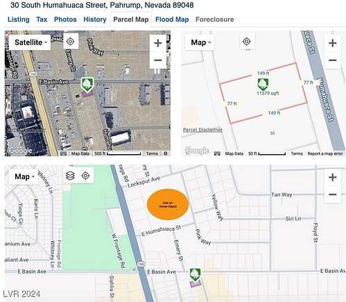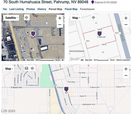 From HWY 160, head north through downtown Pahrump. Go past HWY 372. Turn right at Basin Ave. Turn right at S. Humahuaca St. Four (4) contiguous parcels will be on the right side of street.