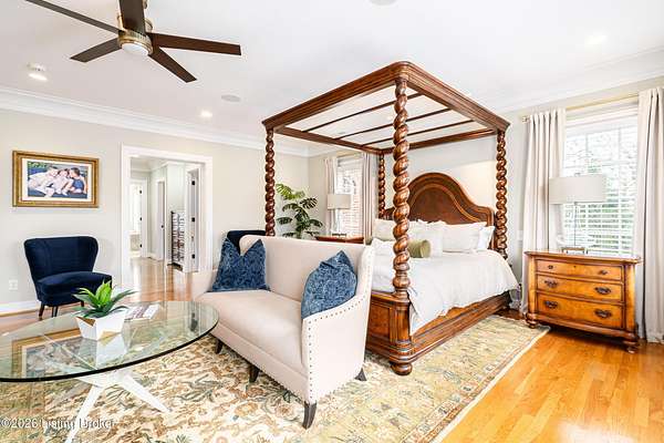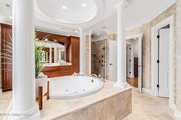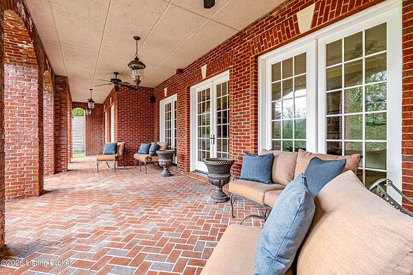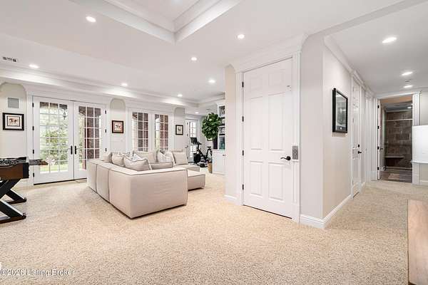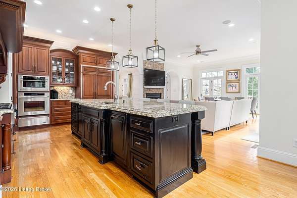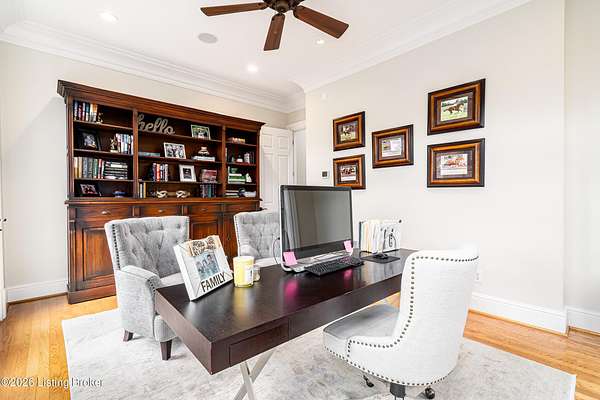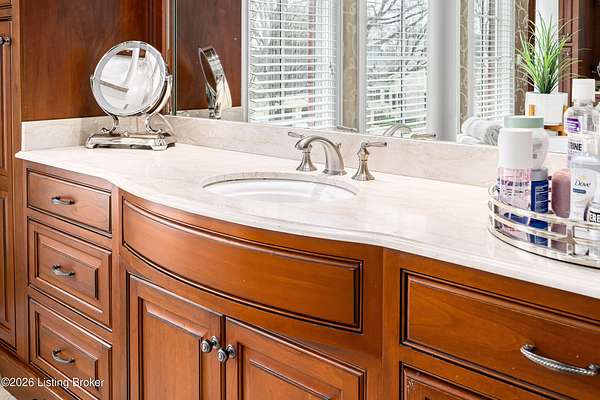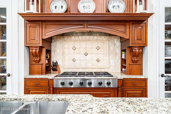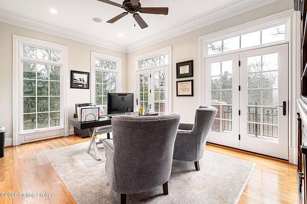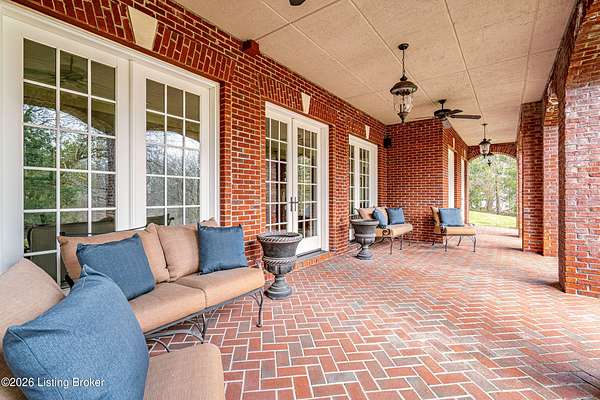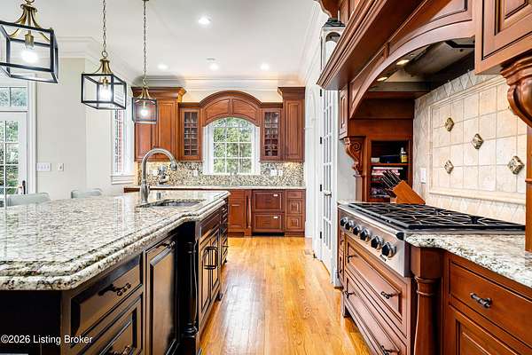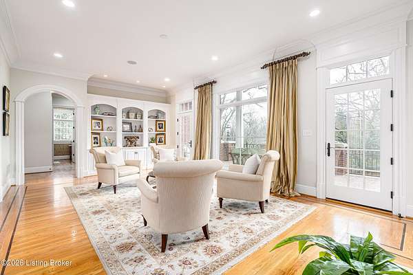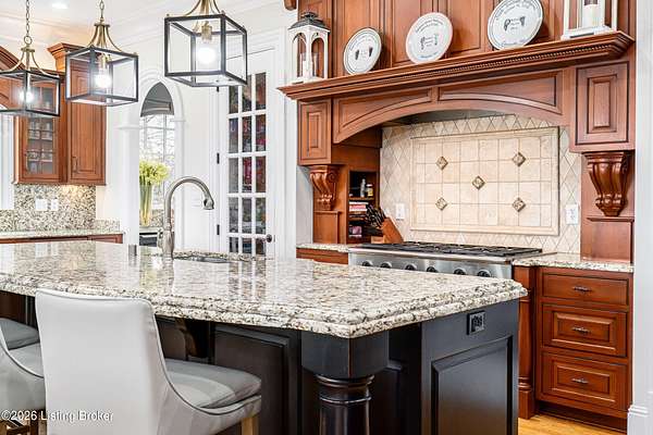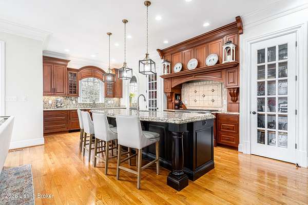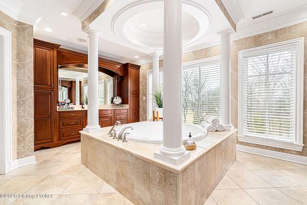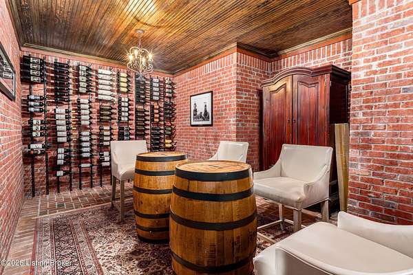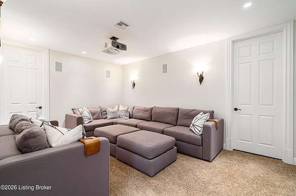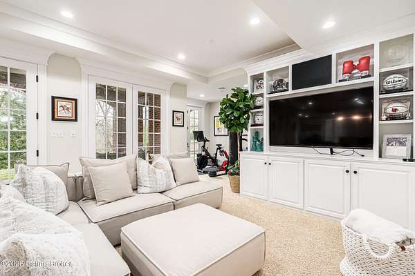Custom-built in 2006 and ideally situated on over 1.7 acres in prestigious Indian Hills, this five-bedroom home offers quality construction, thoughtful design, and modern efficiency. Each bedroom features its own en-suite bathroom, along with multiple living spaces designed for comfort and entertaining. The home includes geothermal heating and cooling, a new roof 2026, and an elevator servicing all three floors. The welcoming foyer introduces arched entryways, detailed millwork, hardwood flooring, and vaulted ceilings that continue across the main level. The great room features built-in bookcases, a gas fireplace, and expansive rear views from the balcony that spans the back of the residence. The gourmet kitchen offers an oversized island, custom cabinetry, high-end appliances, and a butler's pantry, with an adjacent formal dining room. A tucked-away office space with access to the rear patio has potential for a first-floor bedroom. Upstairs, three generous en-suites include a well-appointed primary bedroom with a sitting area, private balcony access, dual oversized closets, and a spacious bath with soaking tub and separate shower. The lower level expands the home's versatility with a large living area, full kitchen, theater room, hidden wine cellar, and additional bedroom suite. A three-car garage completes this exceptional Indian Hills property. Featured in a Courier Journal article dated April 23, 2023.