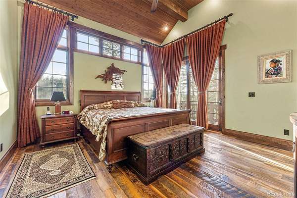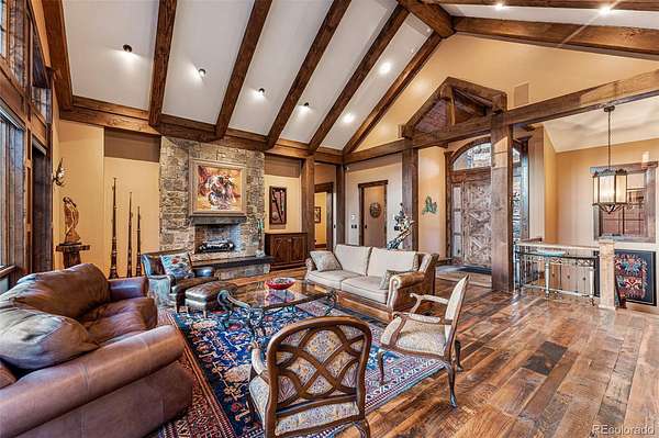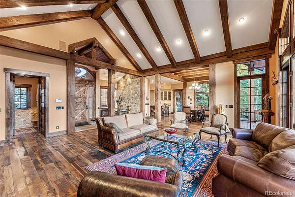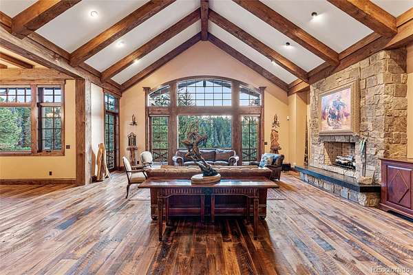 Designed by award-winning TKP Architects, the home boasts soaring timber beam ceilings and expansive picture windows that invite natural light and showcase the surrounding beauty. The 400-year-old reclaimed oak floors add rustic elegance to the open floor plan.