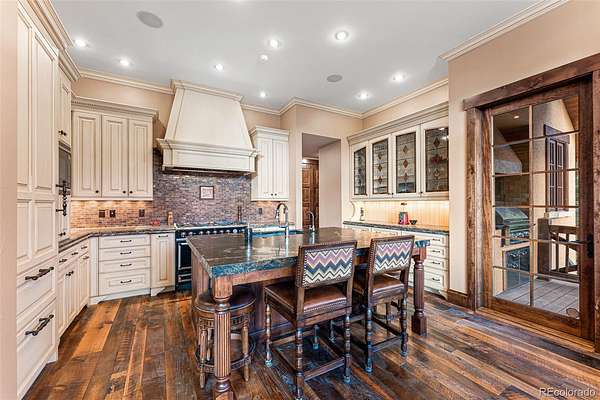Culinary enthusiasts will appreciate the William Ohs-designed kitchen featuring a La Cornue CornuFe range, Sub-Zero refrigerator/freezer, custom cabinetry, leathered Quartz countertops, real copper backsplash, and an oversized island with seating, making it ideal for both everyday living and entertaining.