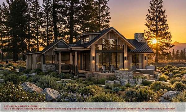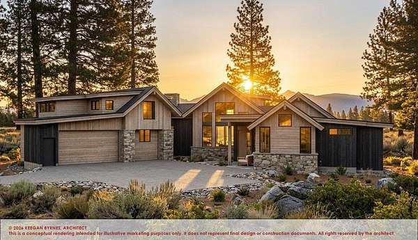 This serene Lahontan homesite features gentle terrain and backs to the Maris Valley open space and trail system. The .6-acre lot is positioned for endless sun, light and tranquility throughout the year. Set on a quiet cul-de-sac, the location enjoys glimpses of the surrounding mountains while being close to Lahontan’s main amenities, including the Tom Weiskopf-designed masterpiece golf course, sports field, Par 3 course, tennis and pickleball center, day spa and fitness center. The Lahontan community and golf club promises endless opportunities for adventure, enjoyment and the ability to create a dream retreat. Design inspiration rendered by local architect, Keegan Byrnes. This conceptual residence illustrates the feasibility of a ±3,700 square foot custom home on the property, oriented to capture eastern views across the Martis Valley and beyond. The main level is designed for single-level living, with four bedrooms including a primary suite and guest suite with en-suite baths, a dedicated office, four full bathrooms, one half bath, and an open-concept great room integrating kitchen, dining, and living... all framed by the views. The upper level offers a flexible retreat with a recreation room, bunk room, and shared bath. Outdoor living is woven throughout the design, with a covered dining terrace, built-in BBQ, firepit terrace, hot tub space, and a three-car garage. Renderings are AI-generated and intended for conceptual purposes only. All designs are subject to Lahontan Design Review approval and have not yet been submitted or reviewed.
