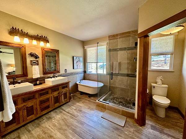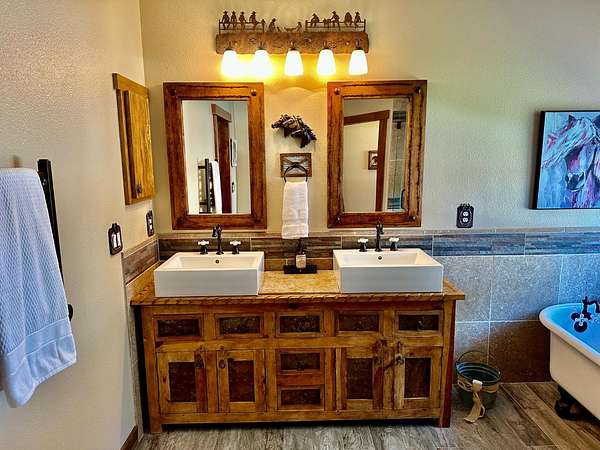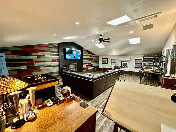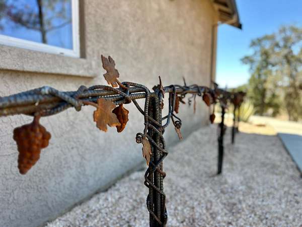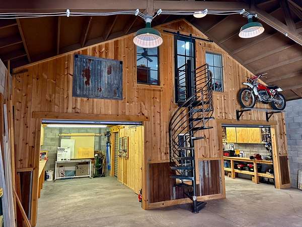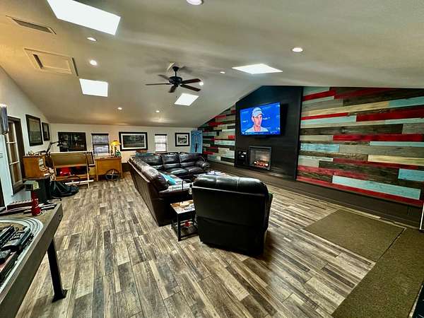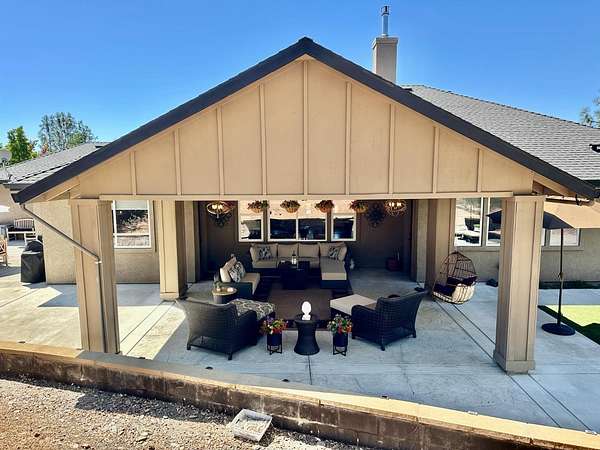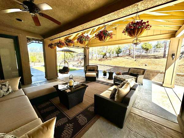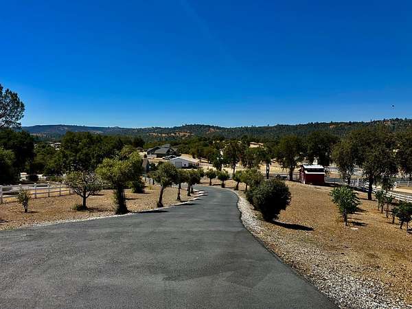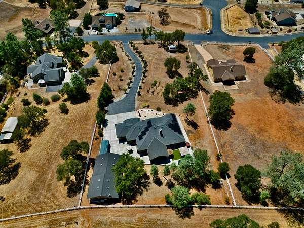 Nestled on a picturesque 1.7-acre parcel within the Bridlewood subdivision, this beautiful 2,416-square-foot home offers both privacy and breathtaking foothill views. Enter through a private gate and up a sweeping driveway lined with fruitless olive trees, leading to a home designed for comfort and modern living. Inside, you'll find an inviting floor plan. The great room, featuring engineered hardwood flooring, coved ceilings, and a cozy fireplace, overlooks a covered patio and the stunning views. The kitchen is equipped with LG appliances and a breakfast bar, with an adjacent dining area that offers easy access to a side patio that is pre-plumbed for an outdoor kitchen. A large office with foothill views and a dining room (currently housing a full-sized pool table) are also conveniently located near the kitchen. The home includes a primary suite with a large sitting area, access to the patio, and large windows. The primary bathroom is a retreat with heated floors and towel rack, dual sinks, custom cabinetry, and a large walk-in shower and spacious walk-in closet. Two bright and spacious guest bedrooms with beautiful views share a guest bath with dual sinks and a tub/shower. The pristine grounds are a masterpiece of thoughtful landscaping and lighting. Enjoy mature oak, apple, orange, and pomegranate trees, along with table and wine grapevines, all maintained with a convenient drip and sprinkler system. Custom hardwired lighting highlights the entire property, from a decorative fountain and horse statue at the entry to the home. A small barn with a storage room for a quad and a yard trailer makes maintenance of the grounds a breeze. This property is a car enthusiast's dream. The attached three-car garage is wired for a 50-amp vehicle charger, while the detached 1,500-square-foot workshop/garage is a sight to behold. This space features two large roll-up doors, an open area with ample room for multiple vehicles, and two smaller bays at the rear for car storage. An overhead pulley system makes moving heavy parts from vehicles to the workbench a breeze. Above the detached garage is a 600-square-foot cave or game room that is perfect for entertaining. It boasts a custom wood-paneled wall, an electric fireplace, and its own heating and cooling system, making it the perfect place to hang out and watch the race. An additional 400 square feet of storage space is also available on this level, perfect for holiday decorations and keepsakes. Additional features include a fully owned 28-panel solar system, making this beautiful estate both luxurious and energy-efficient. It's a truly unique property that feels private and secluded yet is still close to town.