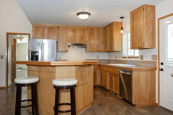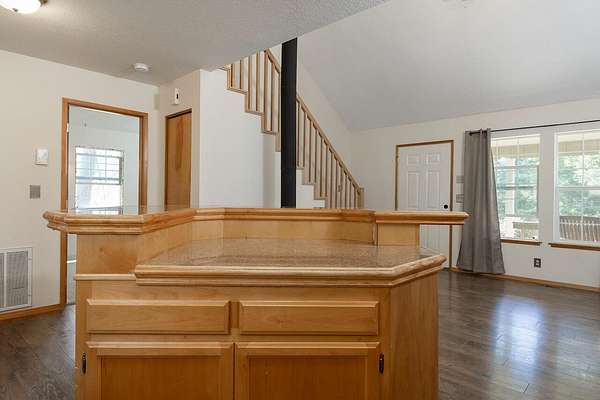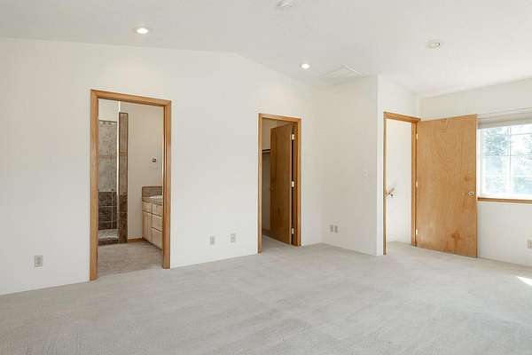 - Breakfast Bar, Ceiling Fan(s), Double Vanity, Fiberglass Stall Shower, Kitchen Island, Linen Closet, Pantry, Primary Downstairs, Shower/Tub Combo, Smart Thermostat, Soaking Tub, Tile Shower, Vaulted Ceiling(s), Walk-In Closet(s)