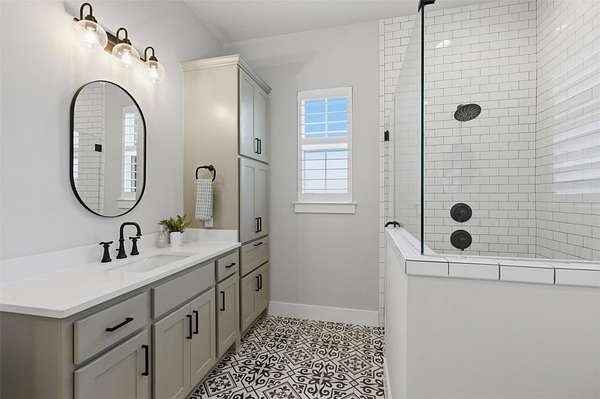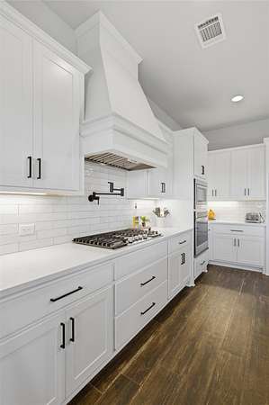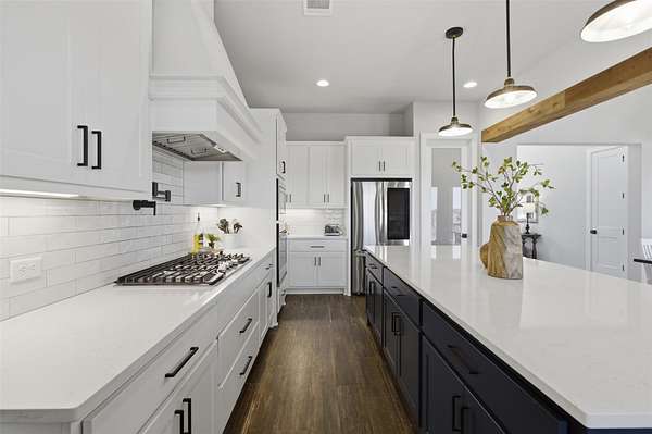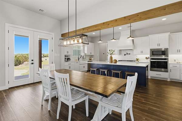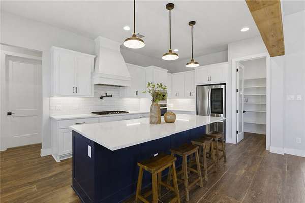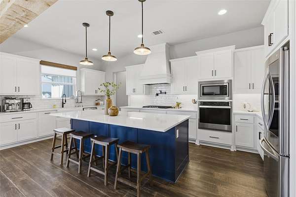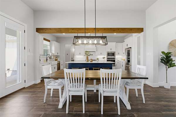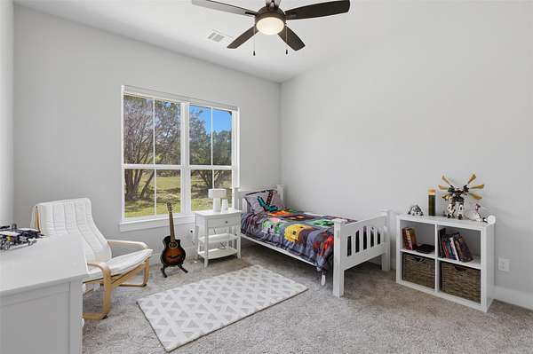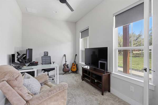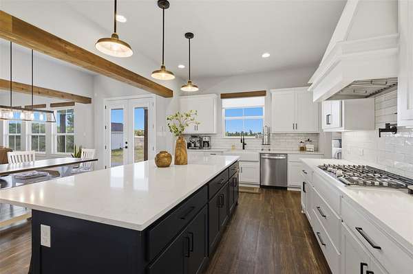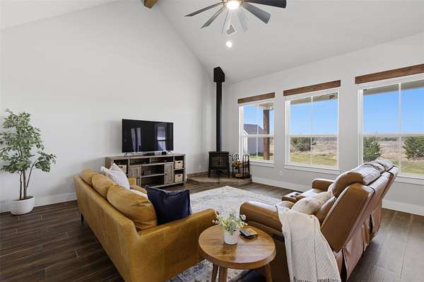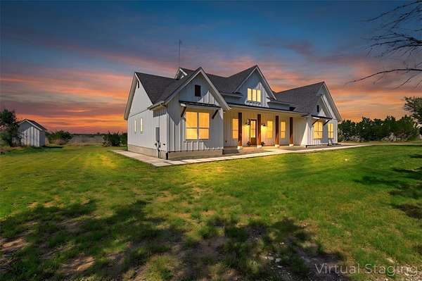 Custom modern farmhouse meets timeless elegance in this stunning property, situated on an expansive & incredibly private 3.08-acre lot showcasing serene Hill Country views & endless possibilities-all with no HOA to limit your vision. Fully fenced with a solar-powered gated entry, the property is equipped with a generator hookup, RV hookup, buried 250-gallon propane tank, hardwired exterior security cameras, & a whole-house water filtration system. A long driveway leads to a side garage featuring epoxy floors. Inside, the home welcomes you with an open layout, soaring ceilings, expansive windows, & beautiful wood-look ceramic tile. The spacious living room is highlighted by a beamed cathedral ceiling, tranquil views, & a striking black wood-burning stove, seamlessly flowing into the dining area & kitchen. The kitchen impresses with quartz countertops, a large island with bar seating, crisp white cabinetry with under lighting & pot filler over the stove, a classic subway tile backsplash, & a custom butler's walk-in pantry. An office/flex space offers versatility for work or hobbies. The primary suite features a cathedral ceiling, an electric fireplace with mantle, & a chic ensuite bath with dual vanities, a soaking tub, frameless glass shower, & a spacious walk-in closet with built-ins. Two additional bedrooms provide flexibility & share a full bath. Step outside to enjoy the expansive backyard, where a large covered patio with a gas stub & a beautifully crafted circular stonework patio create the perfect setting for entertaining or relaxing under the Texas sky. Additional highlights include a spacious storage shed w/tools that convey. With ample room to roam & customize, this property offers the freedom to raise animals, start a garden, build a guest house, or create the lifestyle you've always envisioned. Ideally located just a short drive from H-E-B, shopping, dining, & recreation, & with easy access to TX-195 & US-183.