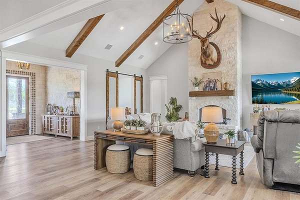 Check out this beautiful 408 acre secluded ranch 8 miles north of Sulphur Springs. Peaceful & quite with abundant wildlife, fishing, and some amazing views. A newly constructed contemporary style ranch house along with new fencing and cleared wooded areas make this a place to see. There are multiple ponds, seasonal creek, flowing spring, and a 9 acre lake stocked with bass, crappie, & catfish. Cross fenced for sectional grazing and working cattle pens. Currently has over 100 head of cattle grazing the fertilized bermuda grass pastures. There is a 2400' shop building with an attached 800' living area. Open 20 x 42 equipment shed and an 80 x 80 hay barn. The house has 10' ceilings, large windows with electric shades, luxury vinyl plank and tile flooring, spray foam insulation, and beautiful room decor.