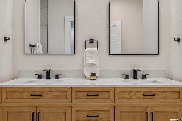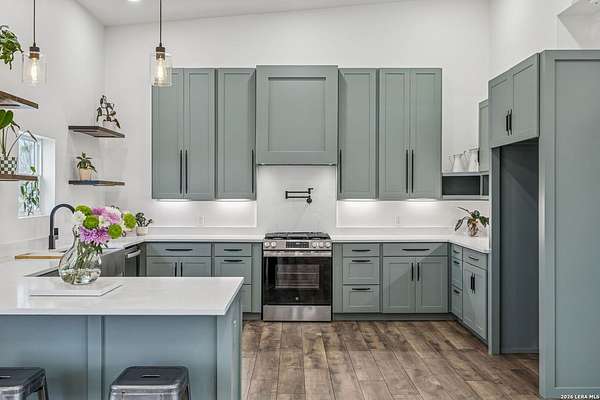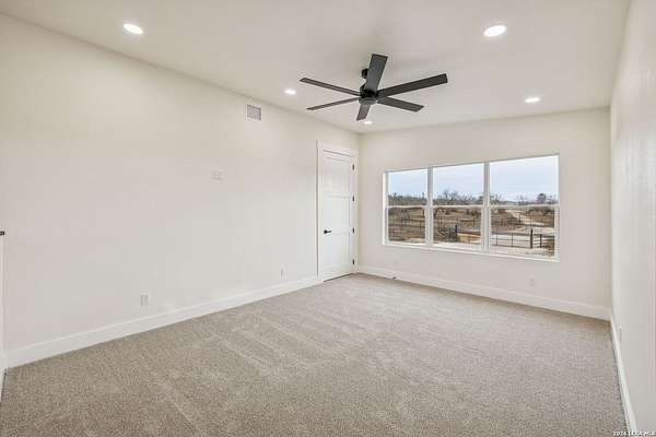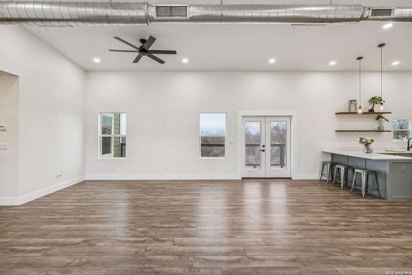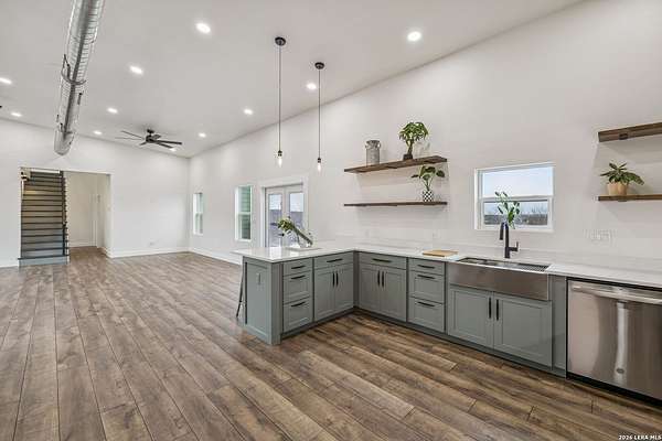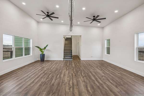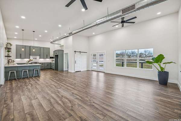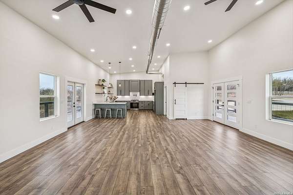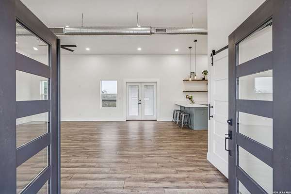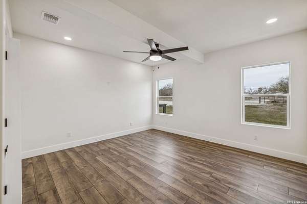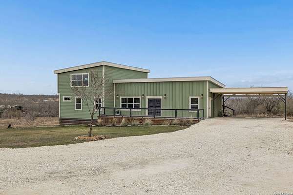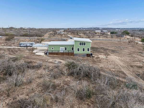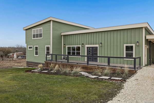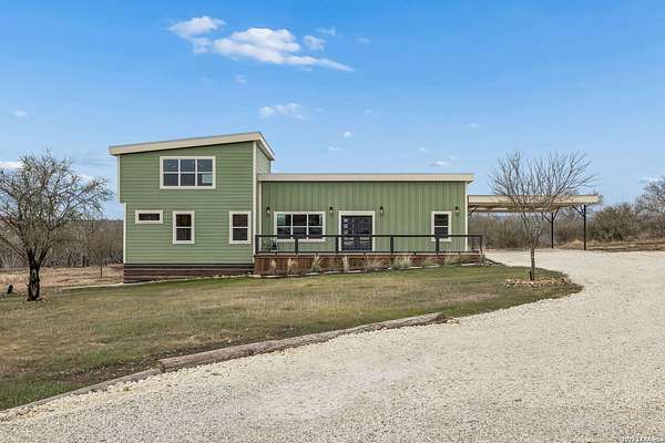 With 5.01 acres to call your own in Castroville's Valley View community, this modern home offers space, privacy, and a slower pace of life, set against open land and wide Texas skies. Step inside to soaring ceilings and an open, light-filled great room that invites you to slow down and settle in. At the center of the home, the kitchen is designed to be used, shared, and lived in, equally suited for quiet mornings or full-house gatherings. Custom cabinetry, expansive countertops, a farmhouse sink, and stainless steel appliances create a space that feels both practical and inviting. A striking steel-and-wood staircase leads to the second level, where you'll find an additional living space with a full bath. This separate area offers flexibility for a game room, home office, or guest retreat. Wood-toned flooring runs throughout the main level, connecting each room with a sense of continuity and comfort. The primary bedroom continues the home's modern aesthetic with thoughtful finishes, including a spa-inspired soaking tub and walk-in shower, perfect for winding down at the end of the day. Outside, the land opens up into something truly special. Wide-open views and mature trees offer both freedom and functionality, while the elevated rear deck provides the perfect place to enjoy peaceful mornings and quiet evenings surrounded by country calm. This home offers a refined take on modern country living, where contemporary design, usable space, and rural tranquility come together in a way that simply feels right.