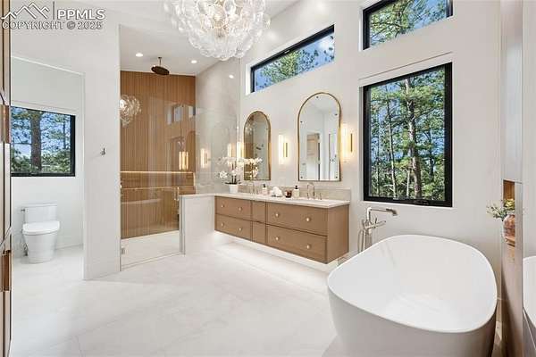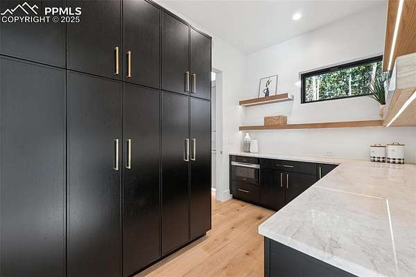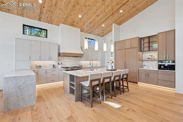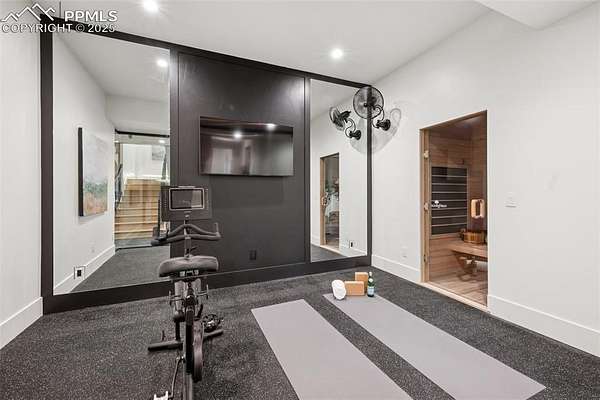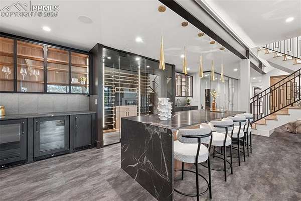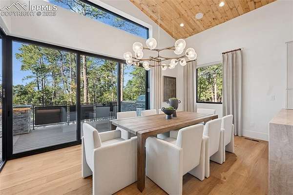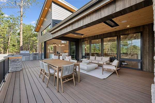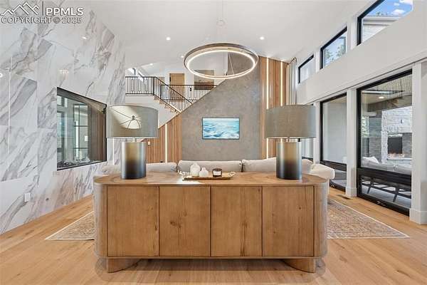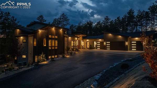 This exquisite custom home blends modern elegance with timeless warm organic design, offering a spacious and functional open layout that seamlessly integrates style and comfort. The heart of the home features a large, chef-inspired kitchen while the lower level features a sleek wet bar with a climate-controlled wine room, perfect for entertaining. A dedicated fitness room with a infrared sauna adds a touch of wellness, while a three-stop elevator provides effortless access to every floor. The sky loft, with its covered deck, offers breathtaking views of the Air Force Academy and Pikes Peak and a serene escape for stargazing. The five bedrooms and four full and two half baths provide ample space for family and guests. Corner patio doors open to the outside into the outdoor BBQ area, blurring the lines between indoor and outdoor living, making the most of Colorado's natural beauty. Custom detailing throughout elevates every corner of this home, creating a TIMELESS luxurious and functional living space designed for both relaxation and entertainment. The foyer's striking 60" see-through fireplace, encased by four sides of marble tile, immediately sets the tone for the home, while framing the stunning Pikes Peak and mountain views beyond. As you step further inside, a seamless blend of transitional and modern luxury defines the space. Subtle nods to midcentury modern can be found, especially in wood wall and ceiling features, introducing textures that balance beautifully with the clean lines and smooth surfaces. Mixed metals from polished nickel to soft golds, unique tile details, and carefully selected lighting elevate every room. The community is part of the award-winning, nationally recognized school district in Monument, Colorado. Homeowners are just minutes away from going anywhere they please for recreation, entertainment, work, and dining. We are less than ten minutes from Colorado Springs and less than forty minutes from south Denver.
