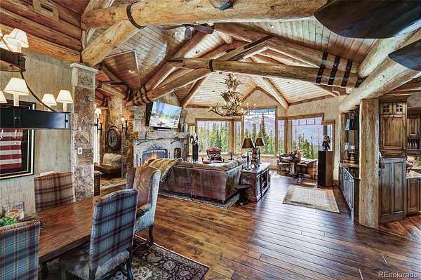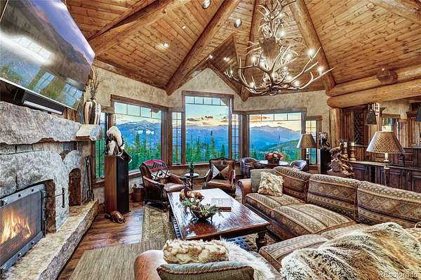 Logs were harvested in the Northwest, milled in Idaho, and reassembled on-site for precision craftsmanship. ~5,800 sq ft plus ~900 sq ft of additional space for guest quarters or expansion. Pre-installed elevator infrastructure, custom ironwork, barnwood and walnut flooring, and six fireplaces complete the home.
