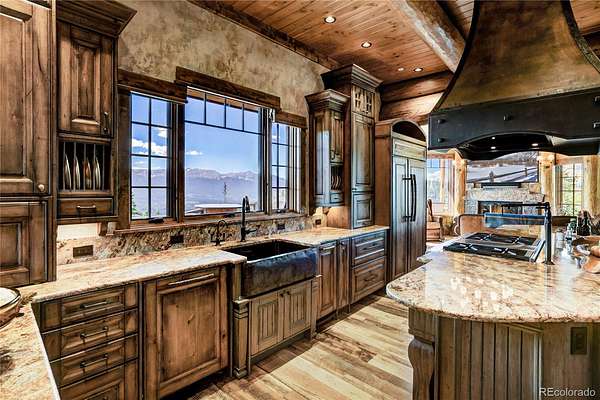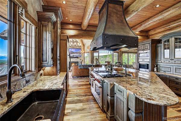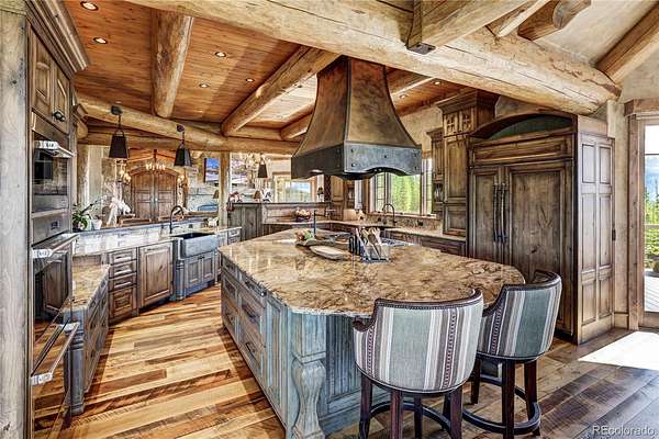 Designed for elevated mountain living, the residence features walls of glass, timeless log architecture, and fully custom finishes throughout. The gourmet kitchen is built for entertaining with six ovens and duplicate appliances including sinks, dishwashers, compactors, and three refrigerators.