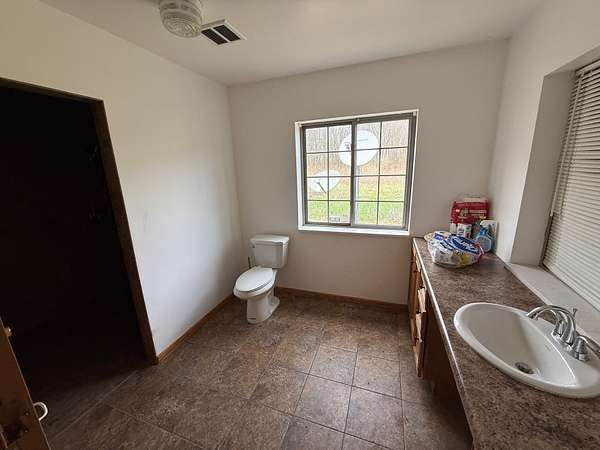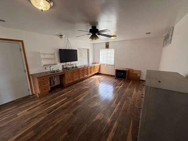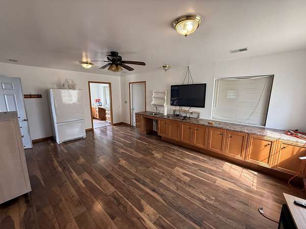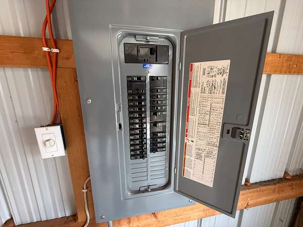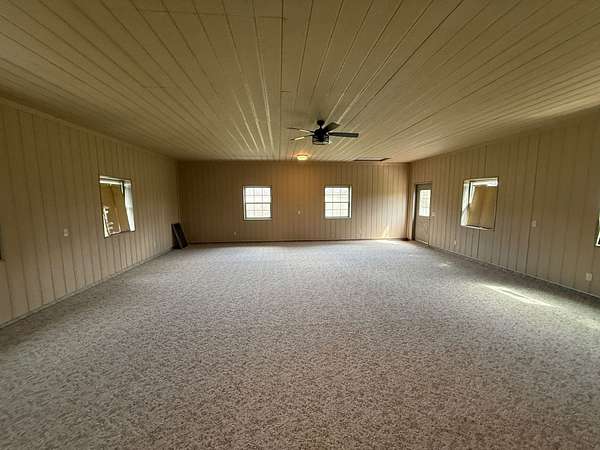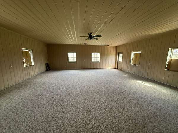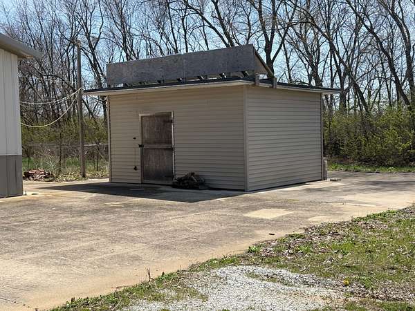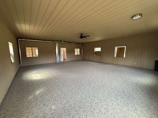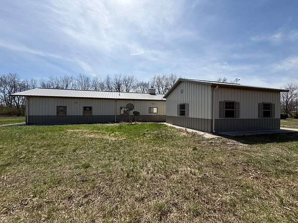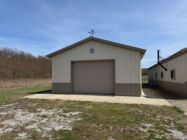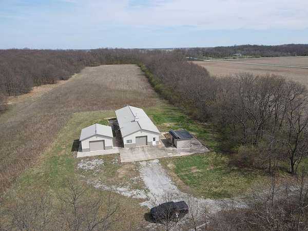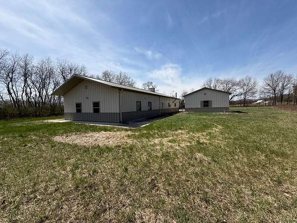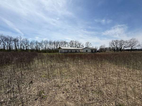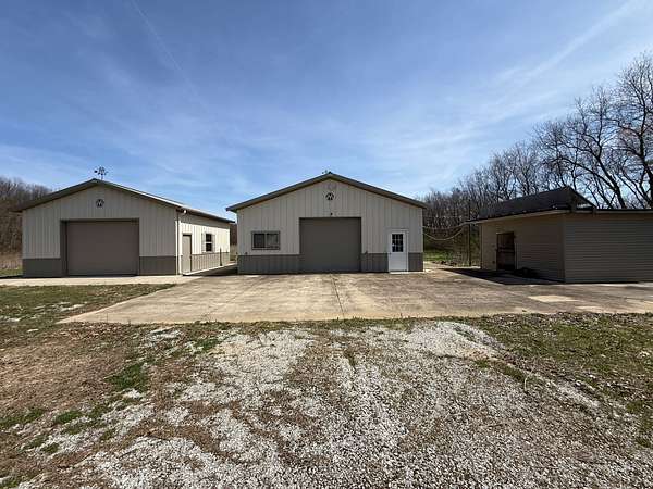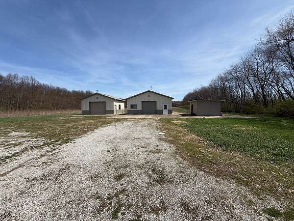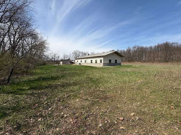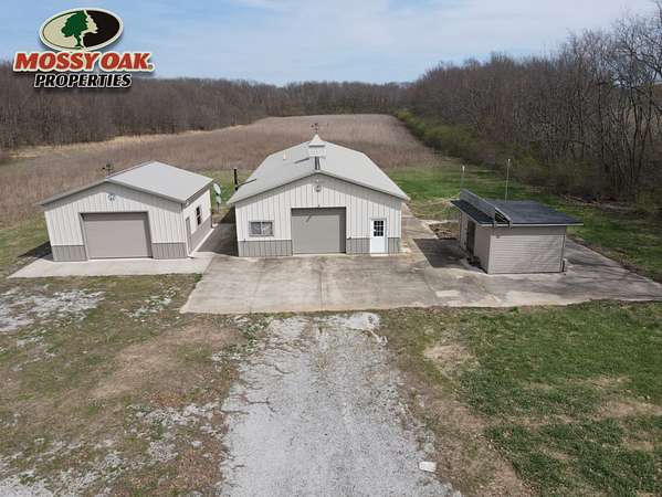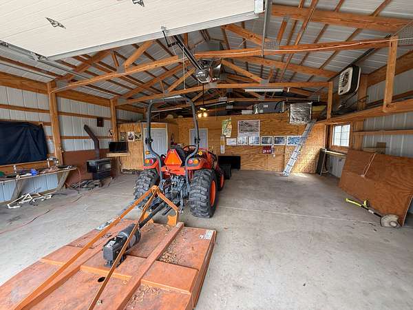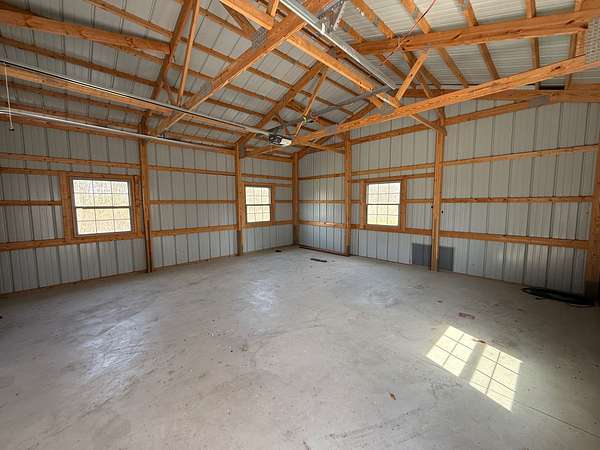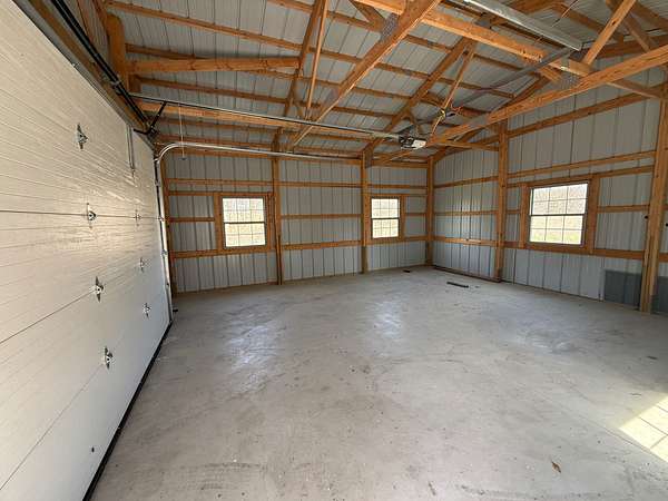 The land includes two Morton pole buildings. One measures 30' x 77' x 10' and features finished living quarters with a kitchen, bathroom with shower, and an open recreational space, along with a shop area for equipment or projects. The second building measures 24' x 24' x 12', has a concrete floor, and was previously used for vehicle storage as well as solar battery and additional storage.