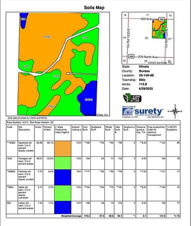 Illinois Farm and Rec Land is proud to present this exceptional Bureau County tillable farm, located just 2.5 miles east of Bradford. This 121+- acre property features 116+- acres of highly productive soils with a strong Productivity Index (PI) of 132, making it an outstanding addition to any farming operation or investment portfolio. Recent soil tests reflect excellent fertility, and results are available upon request. The farm will be offered with open tenancy for the 2026 crop season, providing flexibility for new ownership. An adjoining wind turbine, currently owned by the seller, is also available and can be included for interested buyers--presenting an additional income opportunity. Don't miss this chance to own a high-performing Bureau County farm with great long-term potential.