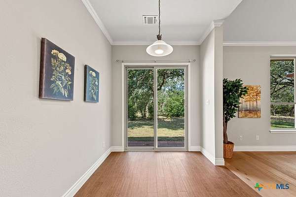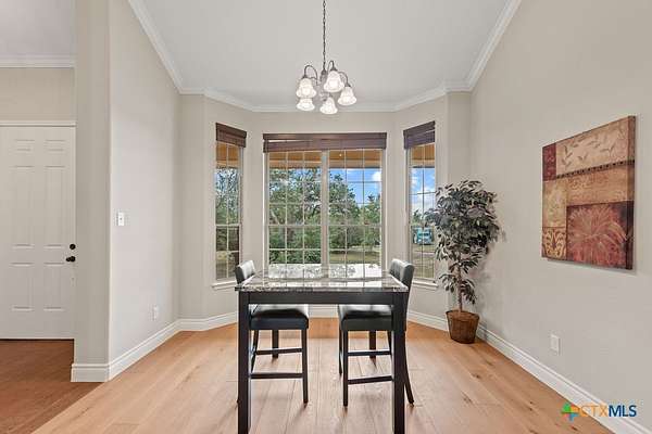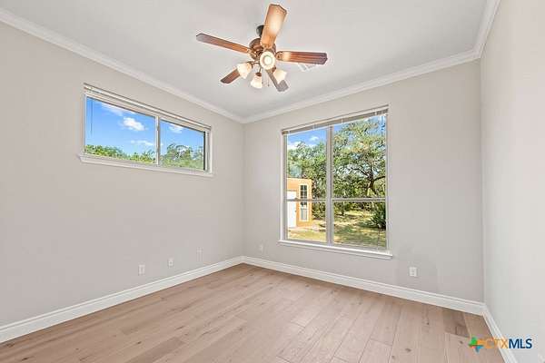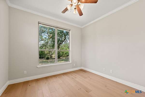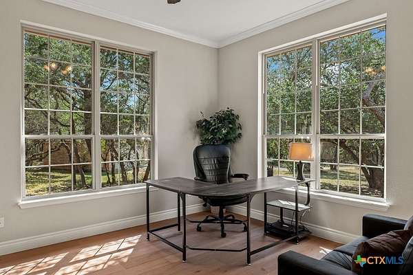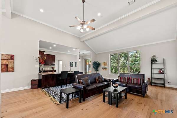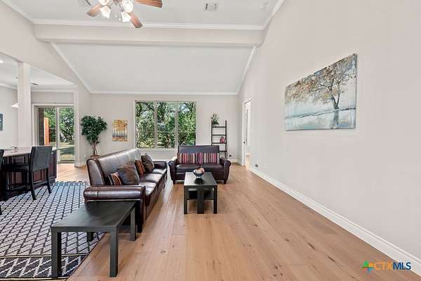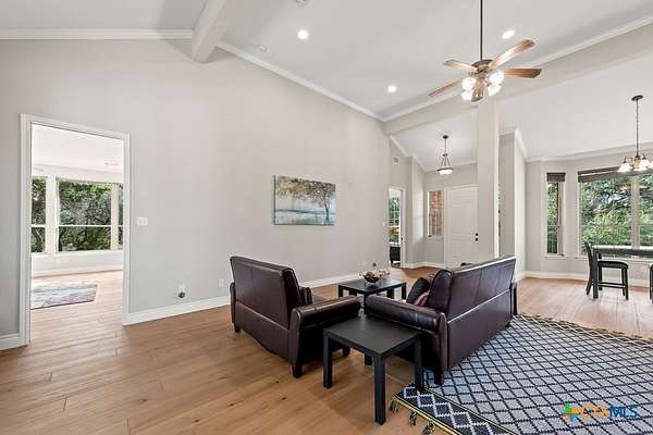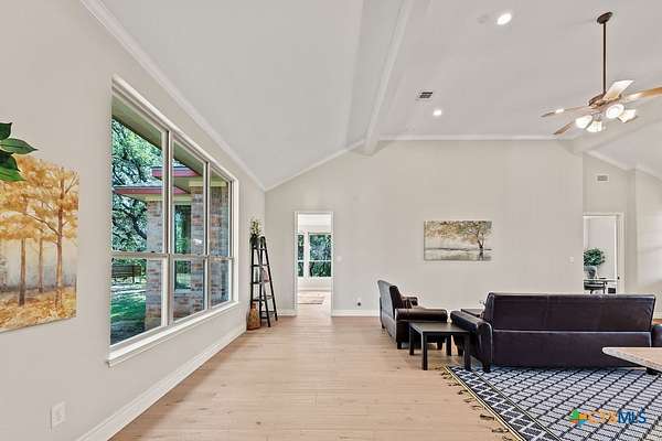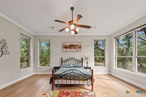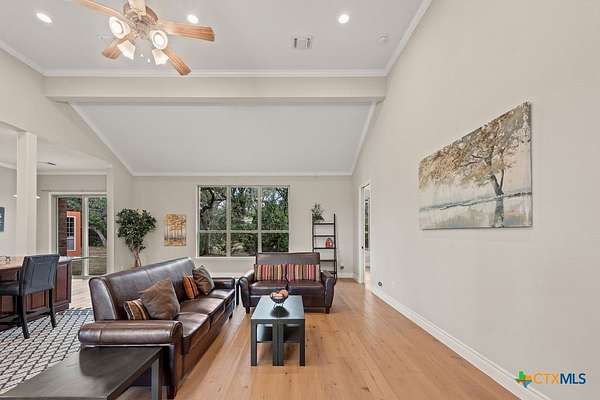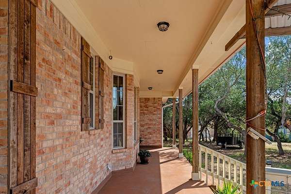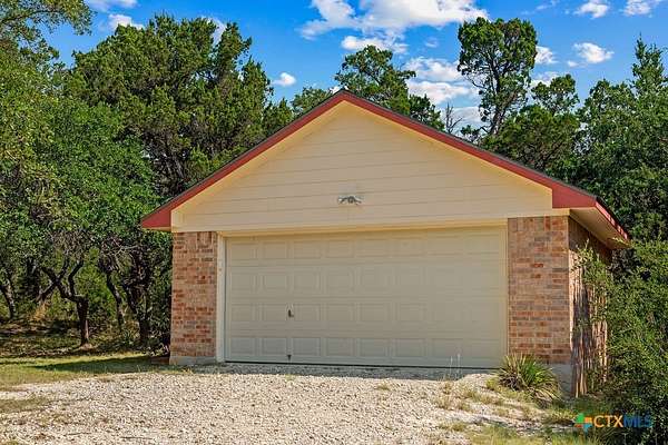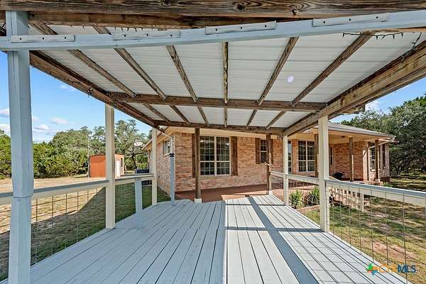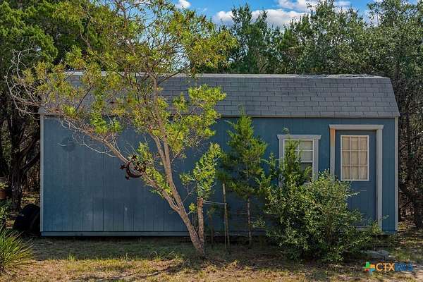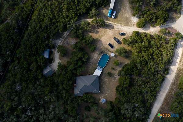 This handsome ranch home is situated in the Ledge Rock community, which boasts numerous beautiful features. It is located on a sprawling 5,100-acre lot. Where Hill Country sunsets span miles. Lush green panoramic views all around. It is an incomparable little gem on a private road. Many trees offer shade during Texas summers. A welcoming, large front porch would be a perfect spot for a morning cup of Joe or a glass of wine after a long day. Your living room is bright and airy, featuring 14-foot high-beamed ceilings, beautiful wood floors, and a wall of windows that allow natural light to flow throughout the house. Pocket doors throughout the house give this home an old-world feel. Your kitchen features granite countertops, a kitchen island with double-sided storage, rich colored cabinets, a pantry, a tile backsplash, a smooth cooktop stove, and a breakfast area overlooking the backyard. The primary bedroom is spacious and serene. It features expansive glass walls that provide an uninterrupted view of the landscape. You'll love recharging in this space. Your ensuite features a double extended vanity, a water closet, a walk-in shower, and a WIC-spacious secondary rooms with wood floors and ceiling fans. Your secondary bath features a pedestal sink and tub/shower combo. One of the many outstanding features of this property is the extensive deck connecting to your above-ground pool. Imagine taking a soothing dip on a hot Texas day. This space is ready for your finishing touches and perfect for a BBQ. Hill Country sunsets paint the sky in golden hues, transforming your backyard into a nightly work of art, with abundant wildlife like Axis Deer and Jackrabbits. You have a detached two-car garage and shed for your favorite gardening tools: a well house, a water softener, and a fully barbed-wired fence. This property has an abundance of wildlife and native plants. Take a short drive to Jacobs Well, or have a fun day exploring Wimberley. LOW TAX RATE AND NO HOA.