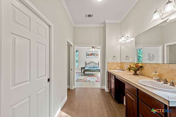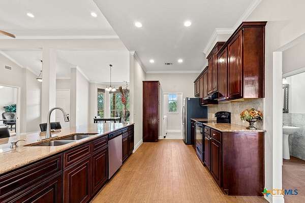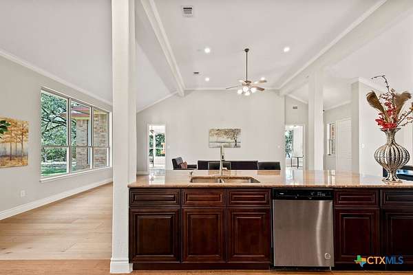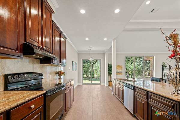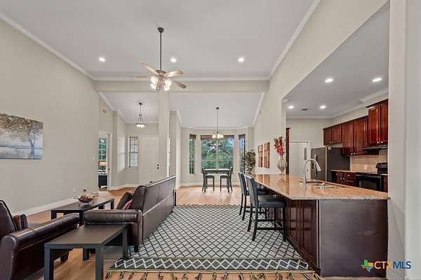 - All Bedrooms Down, Breakfast Area, Breakfast Bar, Ceiling Fans, Crown Molding, Double Vanity, Eat In Kitchen, Granite Counters, Kitchen Dining Combo, Kitchen Family Room Combo, Kitchen Island, Main Level Primary, Open Floorplan, Pantry, Primary Downstairs, Separate Shower, Shower Only, Tub Shower, Walk In Closets