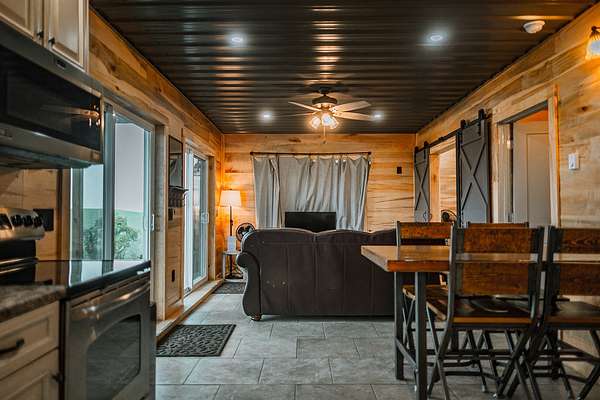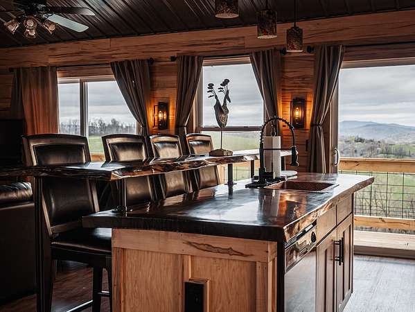 Custom built in 2022/2023 featuring all local wood interior of Ambrosia Maple and Walnut live edge counter tops. Metal roofing and shake siding. The cabin yard is fully fenced for pets and children. The upstairs level has an open floorplan with king bed, living, dining and open full kitchen, full bathroom and laundry hookups. 3 decks (one is covered). Mini split heat/AC and gas logs for ambience and cozy winter heat. The downstairs is another full Living space with 2 bedrooms (king and queen) full bath, laundry/utility room, full kitchen and small dining/living room with a covered patio area outside.